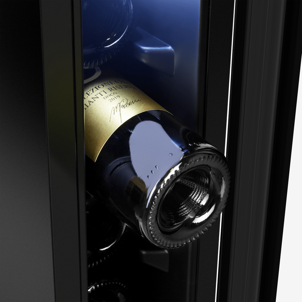 - Защита коллекции: Тонированное стекло дверцы блокирует ультрафиолетовые лучи, которые могут нанести вред вину.