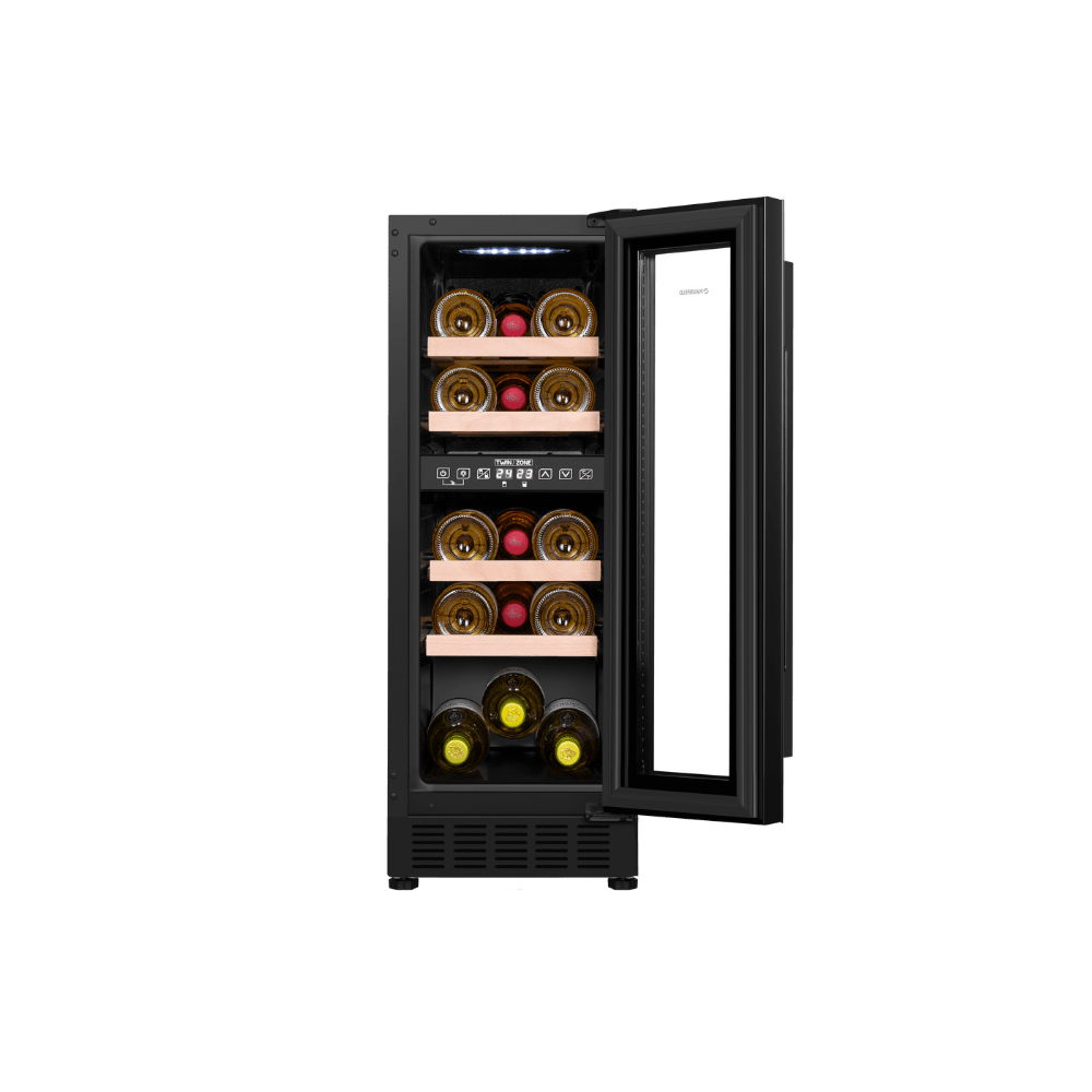 Компактный двухзонный винный шкаф премиум-класса для размещения до 17 бутылок. Элегантный черный металлический корпус со стеклянной дверцей, сенсорное управление и раздельные климатические зоны для безупречного хранения разных типов вин.