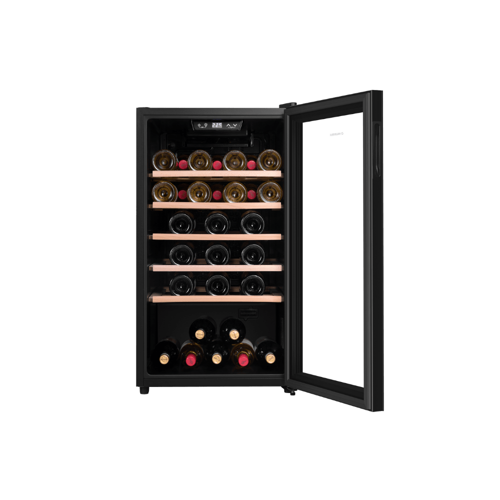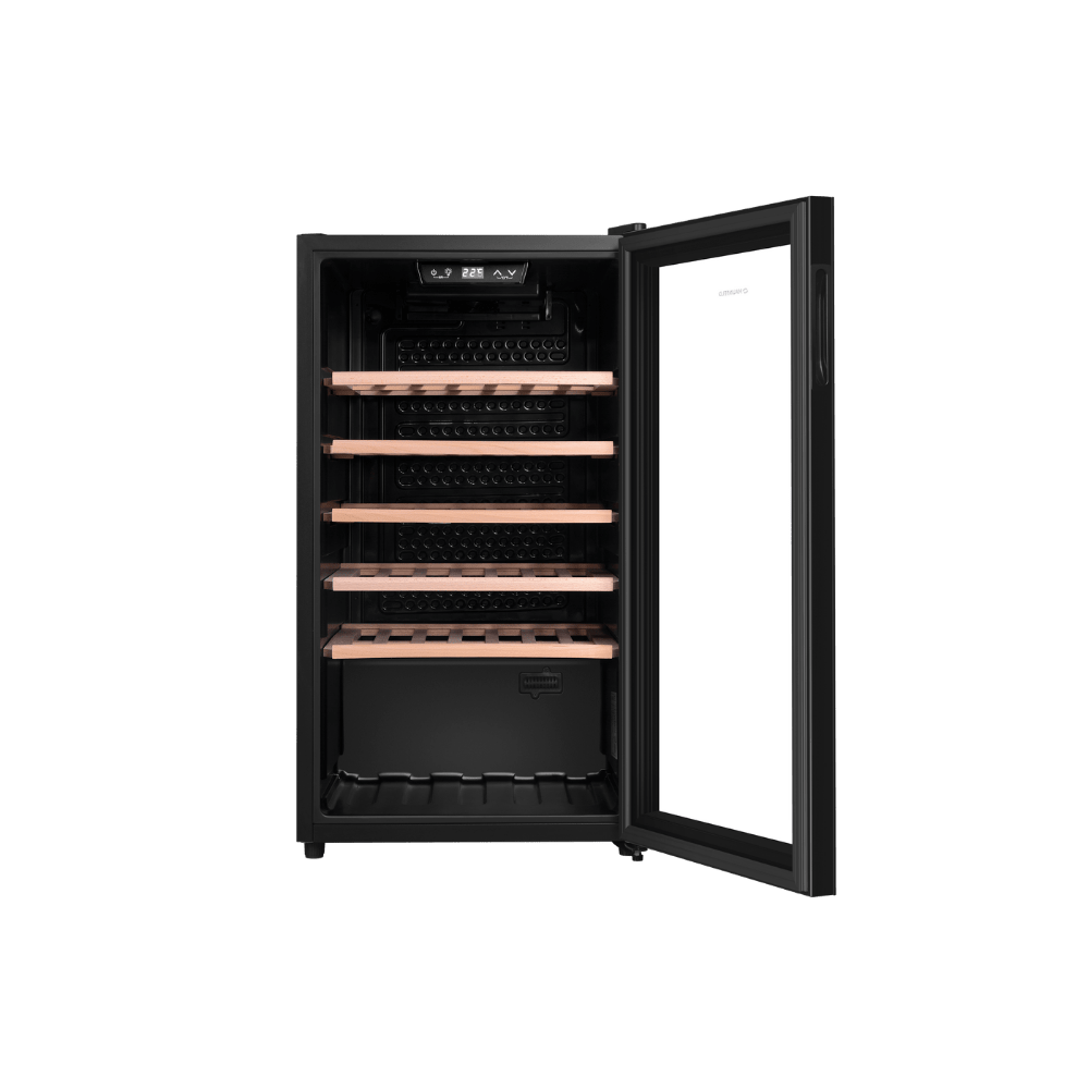 - Надежные деревянные полки из бука: Прочные и эстетичные полки из натурального бука безопасно удерживают бутылки, предотвращая вибрацию, и не влияют на вкусовые качества напитков, обеспечивая правильное хранение.