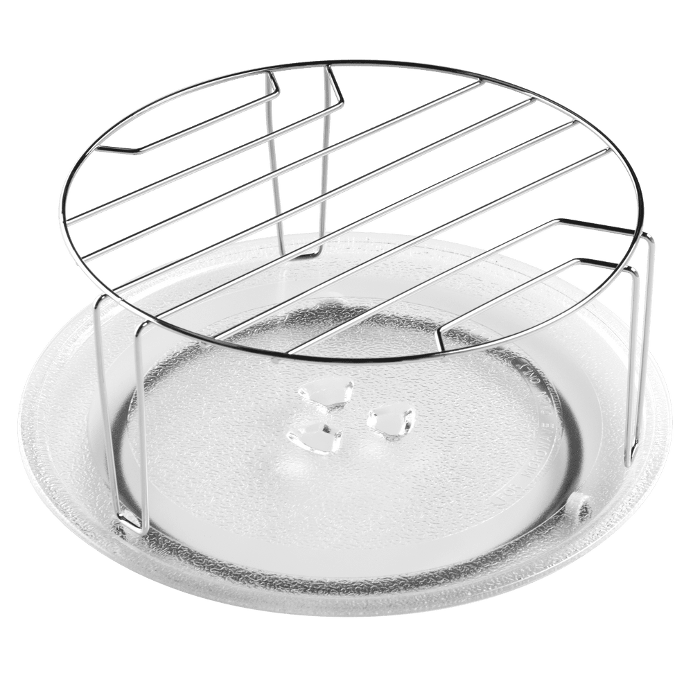 - Комплектация аксессуарами: Стеклянная вращающаяся тарелка и решетка для гриля для разных способов приготовления.