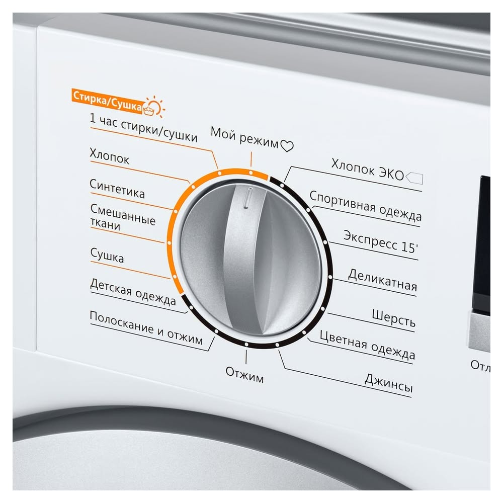 - Функция сушки: Полный цикл «стирка-сушка» за 4,5 часа, позволяющий экономить время и пространство, отказавшись от отдельной сушильной машины.