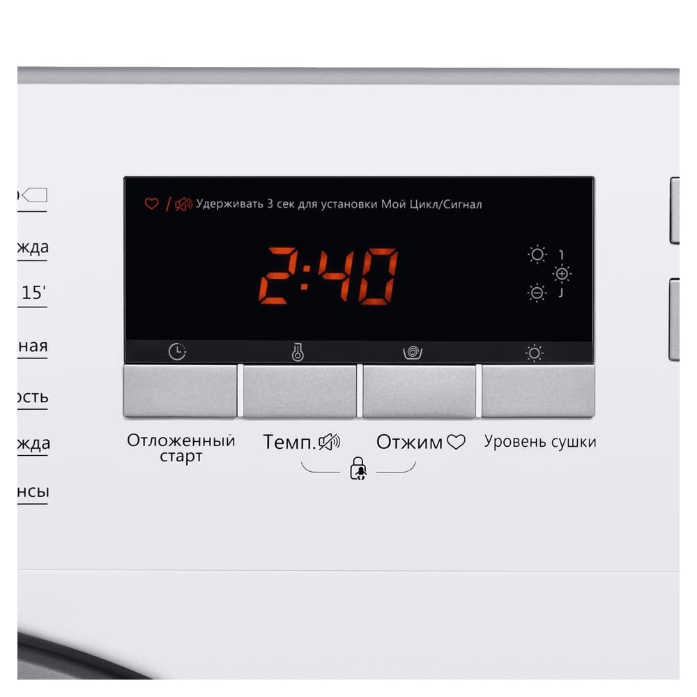 - Удобный дисплей: Информативный дисплей отображает температуру, скорость отжима, оставшееся время и другие параметры.