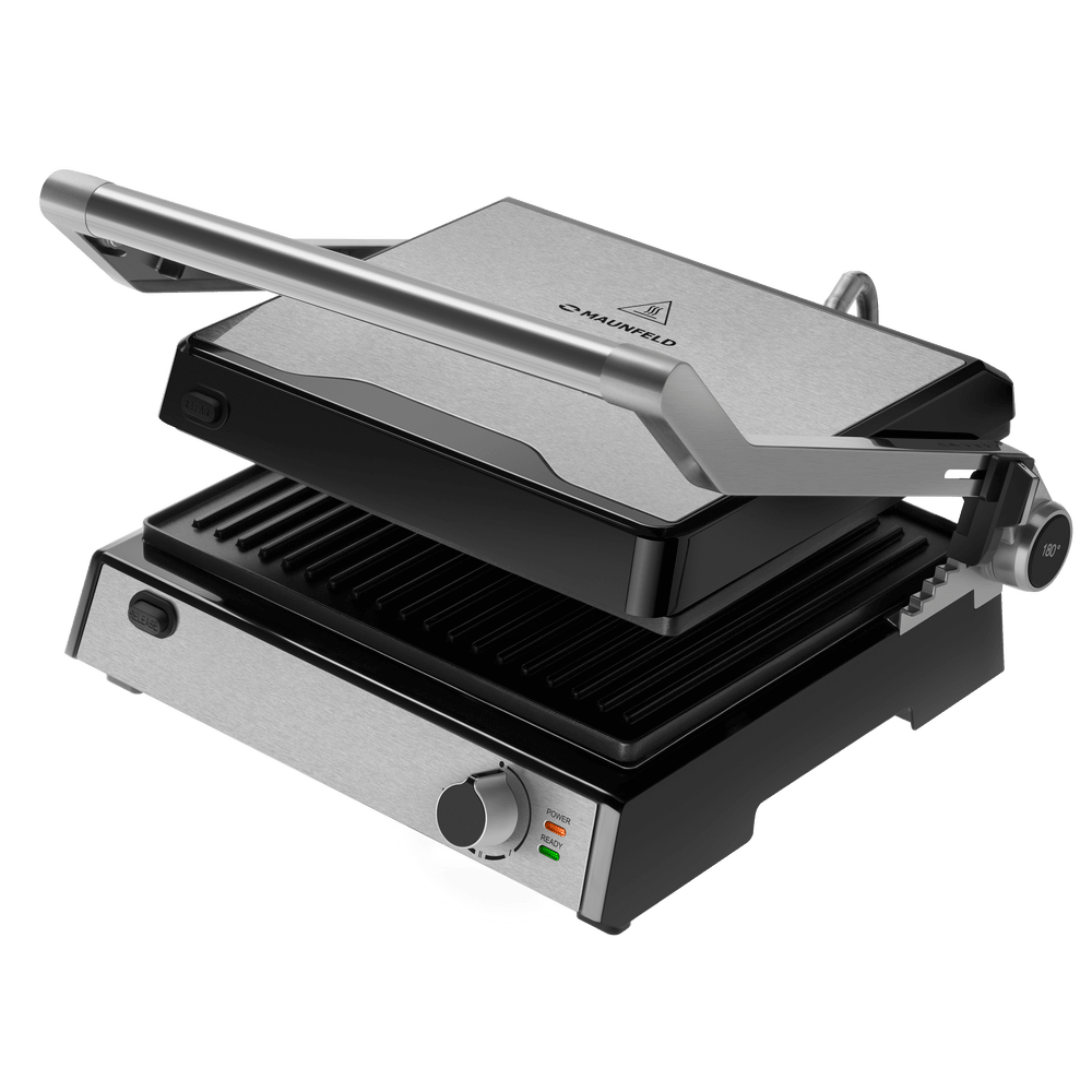 - Крышка откидывается на 180 градусов: Уникальная конструкция позволяет полностью раскрыть гриль, превращая его в две большие жарочные поверхности. Это дает возможность готовить одновременно разные продукты при разной температуре или использовать прибор как просторный гриль для барбекю, когда к вам приходят гости.