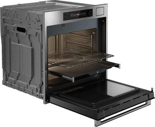 Модель выполнена в цвете чёрная сталь с системой охлаждения дверцы. Это предотвращает нагрев окружающих поверхностей и мебели во время работы устройства.