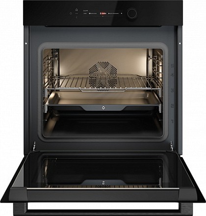 Чёрное стекло на передней панели придаёт прибору современный и элегантный вид. Шкаф обладает вместительностью 71 литр, что позволяет приготовить большое количество блюд одновременно.