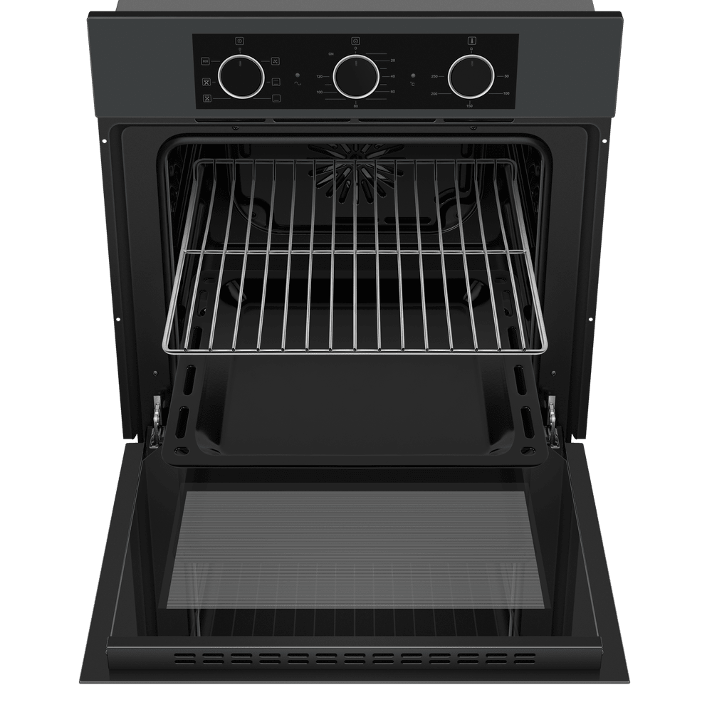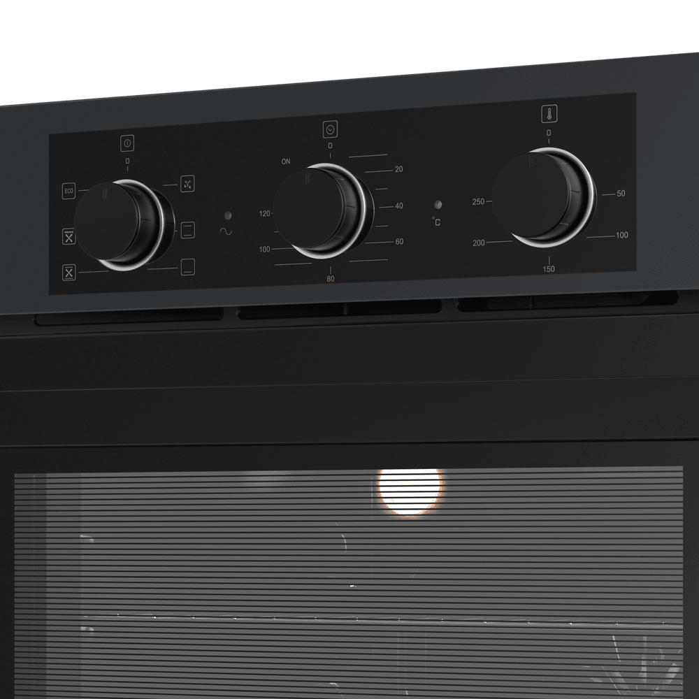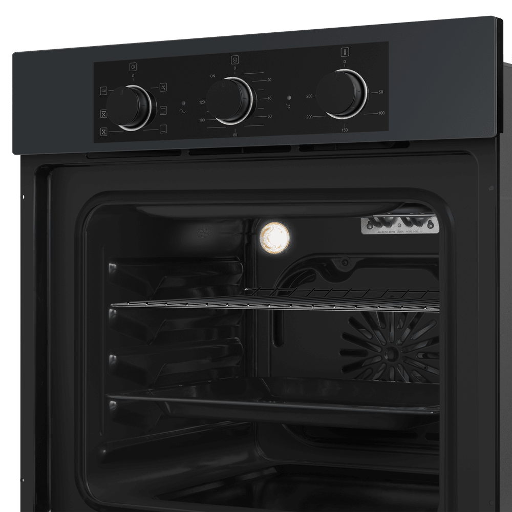 - Современный и стильный дизайн: Графитовый цвет корпуса в сочетании с черной фурнитурой придает модели ультрасовременный и строгий вид. Духовой шкаф не просто вписывается в интерьер кухни в стиле модерн, но и становится ее стильным акцентом, демонстрируя безупречный вкус владельца.
