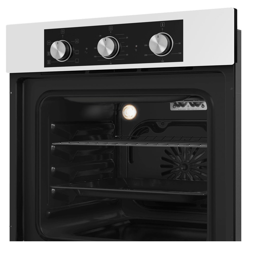 - Классический белый дизайн: Универсальный белый цвет корпуса делает духовой шкаф нейтральным элементом, который гармонично сочетается с любой цветовой гаммой и стилем кухни — от классики до модерна.