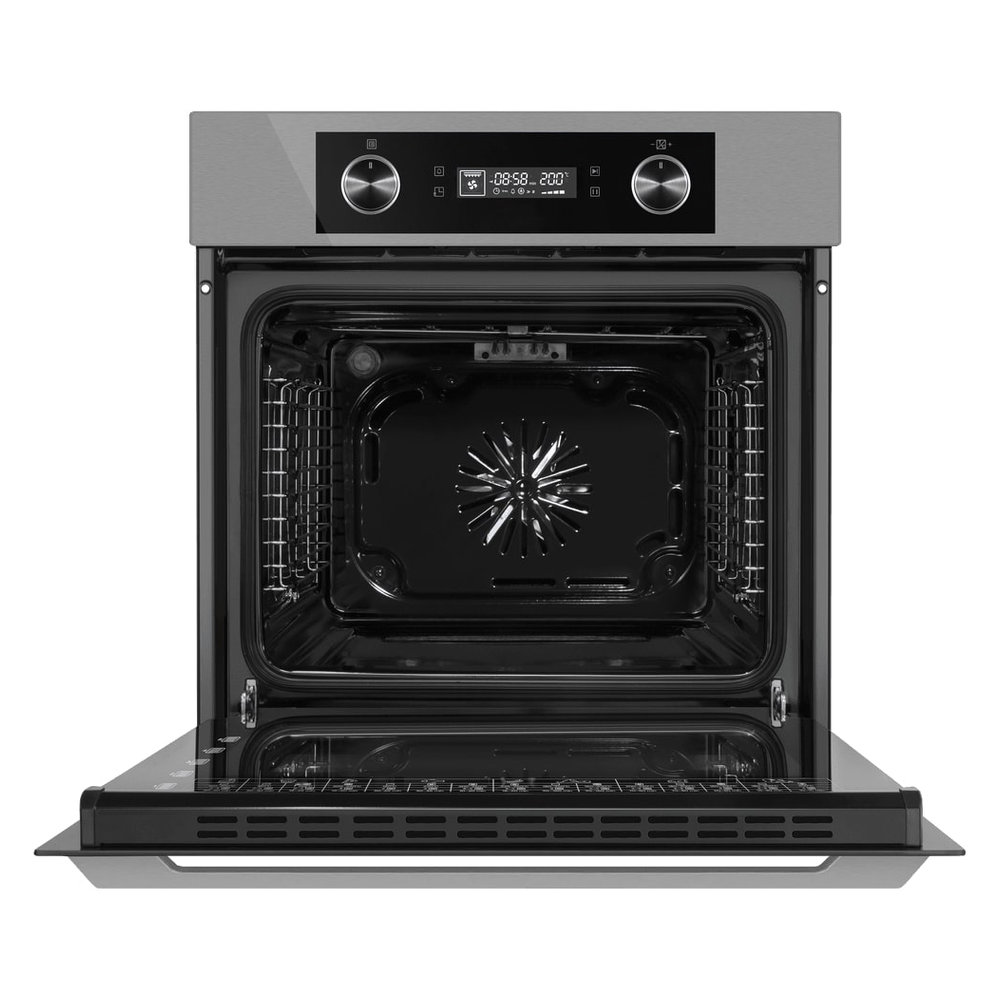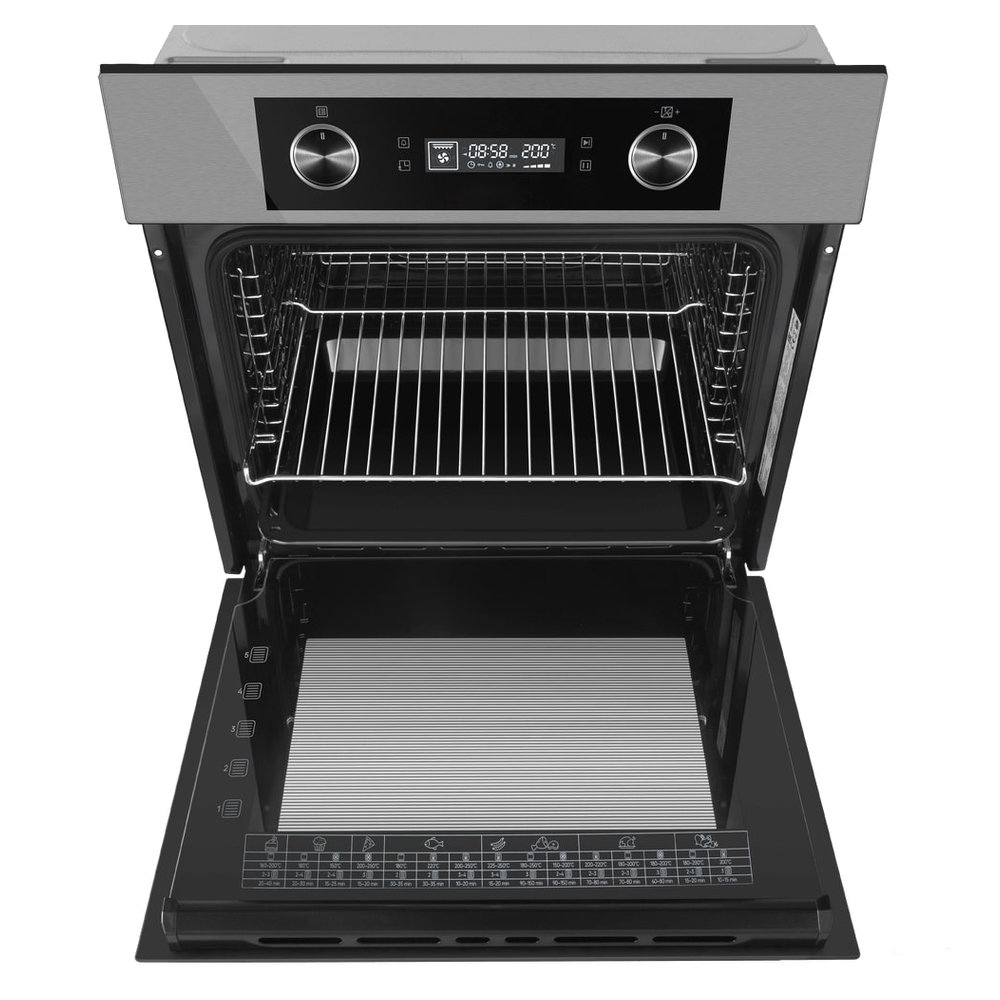 - Высокая вместимость и эффективность приготовления: Рабочая камера объемом 60 литров в сочетании с мощностью 2400 Вт и максимальной температурой 250°C позволяет готовить большие порции или несколько блюд одновременно с минимальными затратами времени. Это делает духовой шкаф эффективным помощником как в повседневной готовке, так и при подготовке к праздничному застолью.