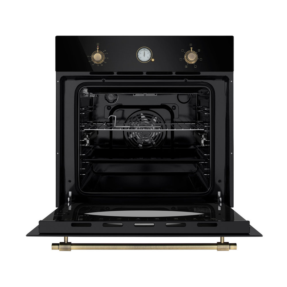 - Эксклюзивный дизайн и удобство эксплуатации: Сочетание глубокого черного цвета и золотистых элементов создает выразительный акцент в интерьере. Внутреннее освещение обеспечивает превосходную видимость, позволяя контролировать процесс приготовления, не открывая дверцу.