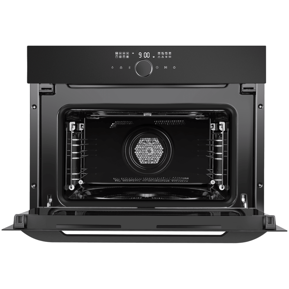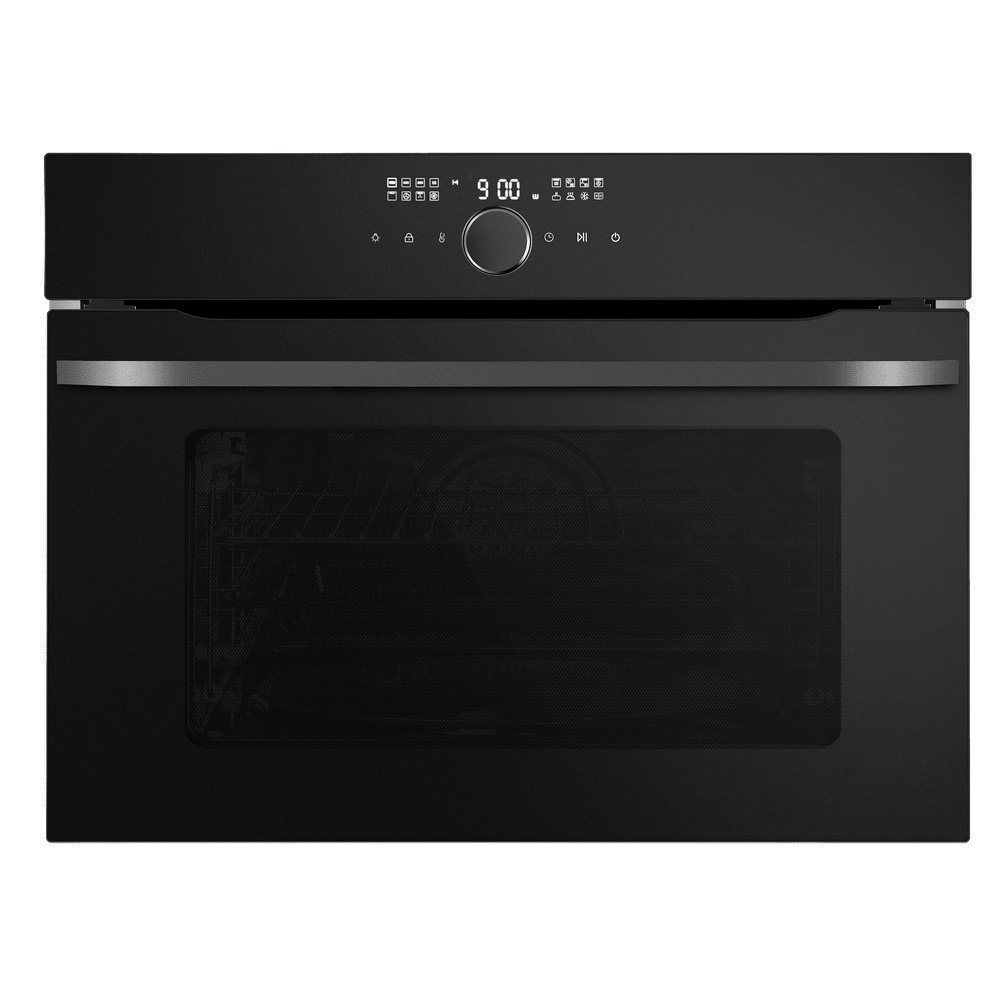 - Элегантный дизайн и компактность: Матовый черный цвет и лаконичные линии корпуса гармонично вписываются в любой интерьер, а небольшие габариты (высота 45.5 см) позволяют установить духовку даже на малогабаритной кухне.