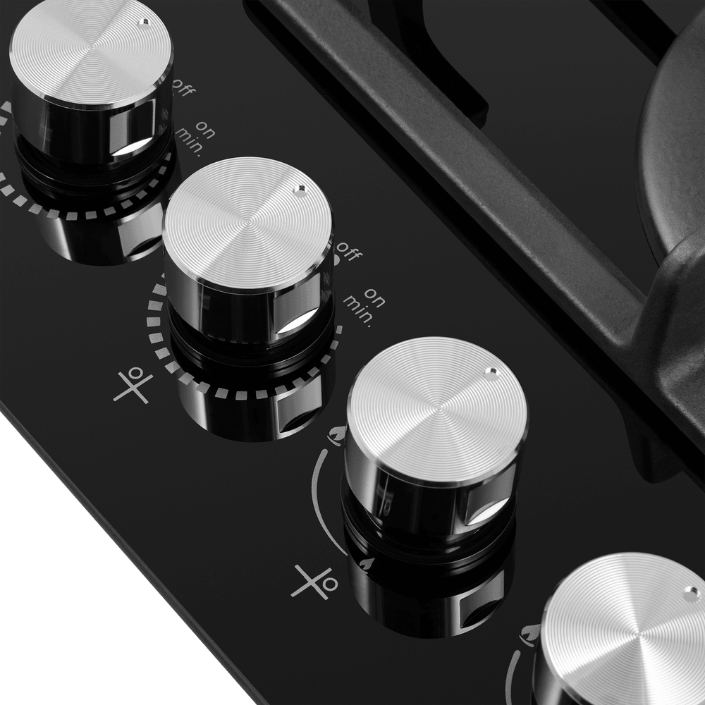 - Прочное стекло и металлические переключатели: Стеклянная поверхность устойчива к высоким температурам и ударам, а цельнометаллические поворотные переключатели обеспечивают долговечность и тактильный контроль.