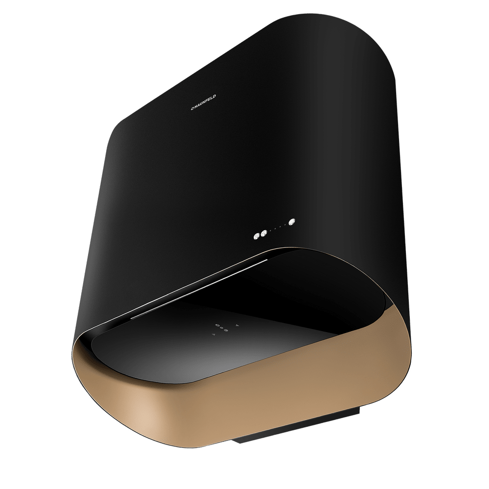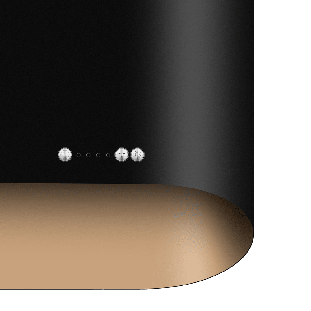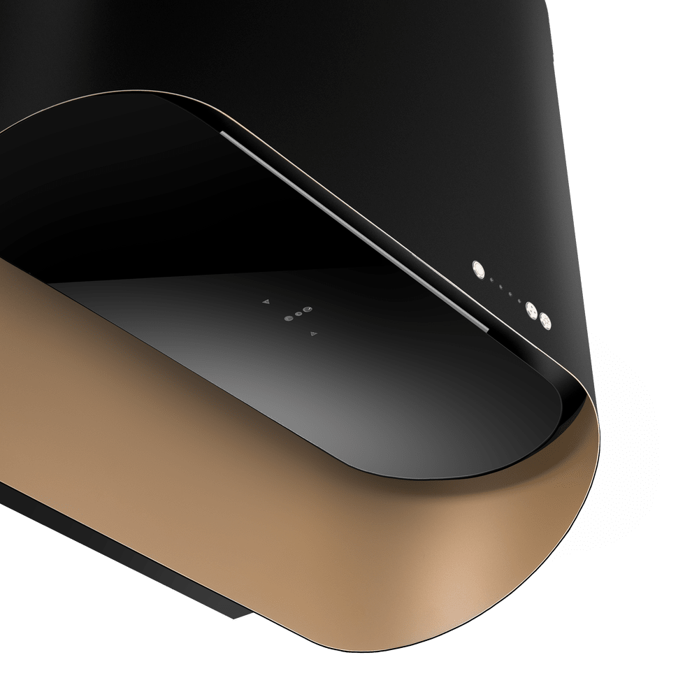 - Элегантный дизайн с черным цветом и золотыми акцентами для стильного интерьера: Цилиндрический корпус в глубоком черном цвете с контрастными золотыми деталями придает вытяжке роскошный и современный вид. Такое дизайнерское решение позволяет ей стать ключевым декоративным элементом, украшающим кухню в стиле модерн, ар-деко или неоклассика.