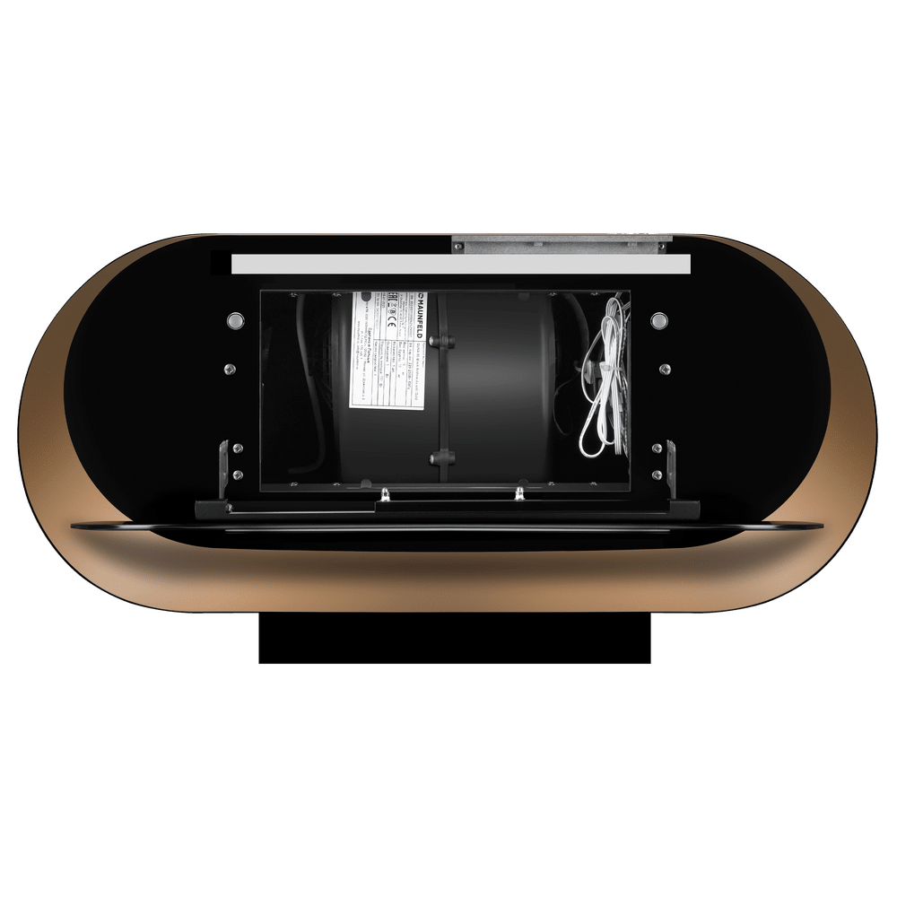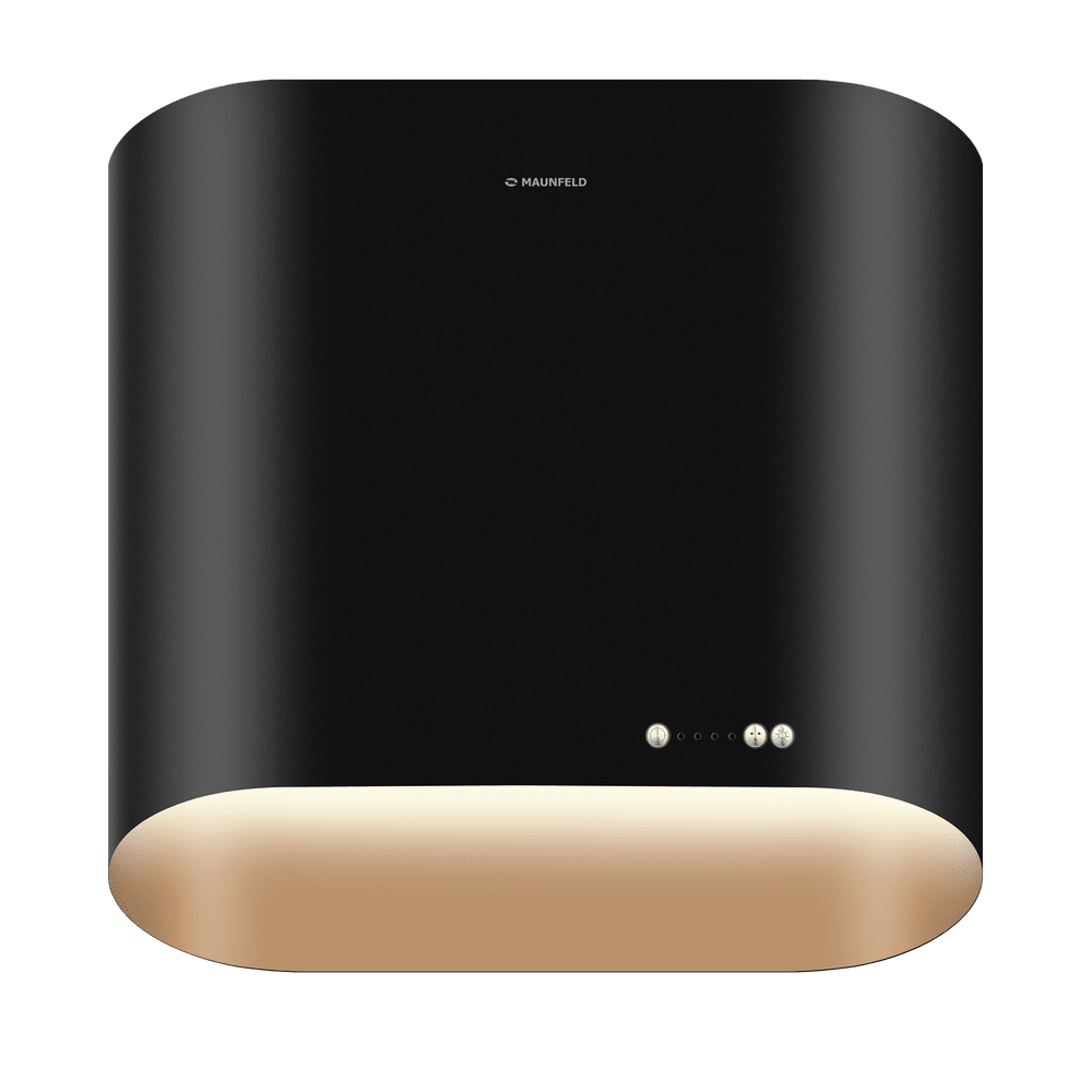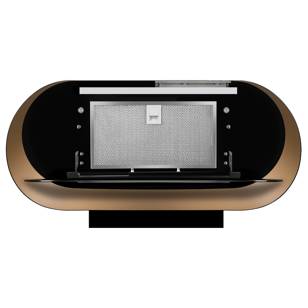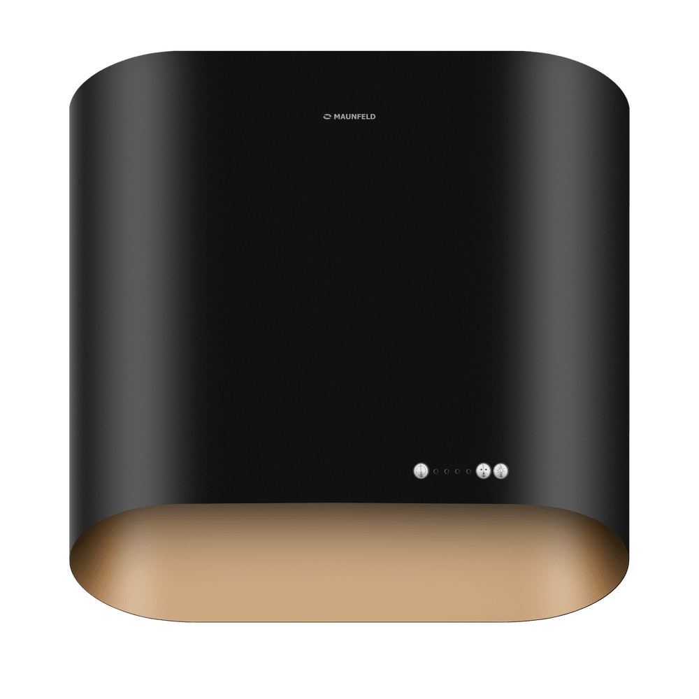 - Элегантный дизайн с черным цветом и золотыми акцентами для стильного интерьера: Цилиндрический корпус в глубоком черном цвете с контрастными золотыми деталями придает вытяжке роскошный и современный вид. Такое дизайнерское решение позволяет ей стать ключевым декоративным элементом, украшающим кухню в стиле модерн, ар-деко или неоклассика.