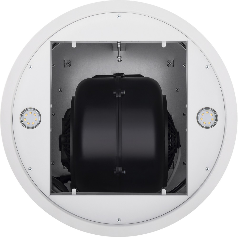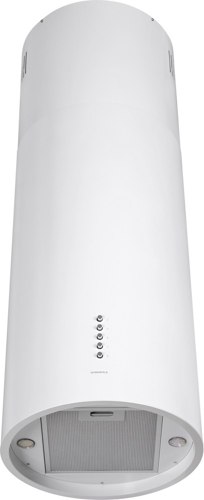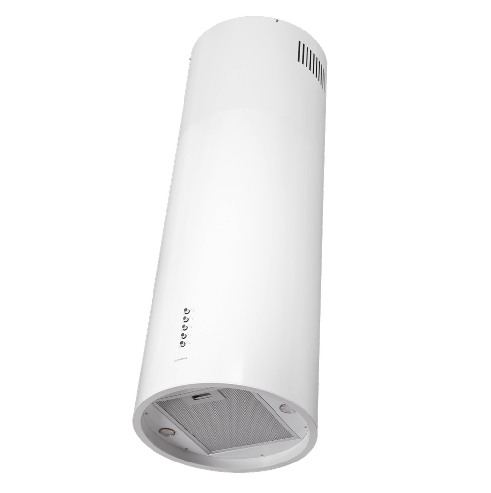 - Стильный акцент в современном интерьере: Цилиндрическая форма и белый матовый цвет корпуса позволяют вытяжке стать неординарным элементом дизайна, подчеркивающим индивидуальность кухни.