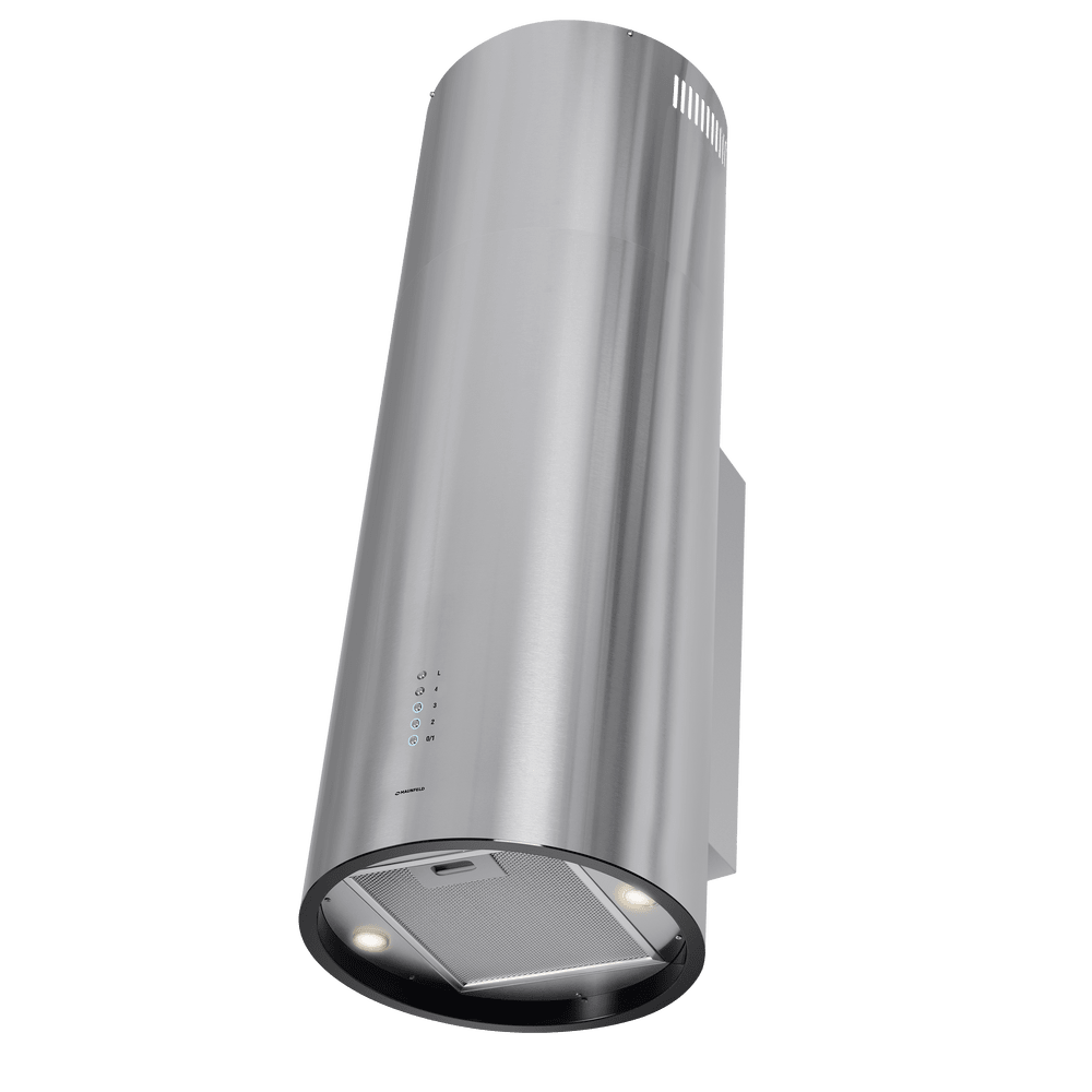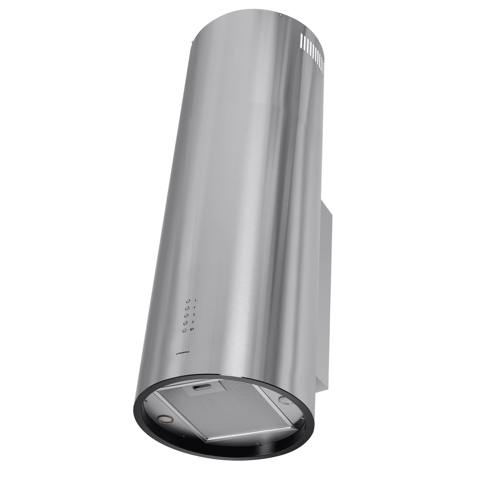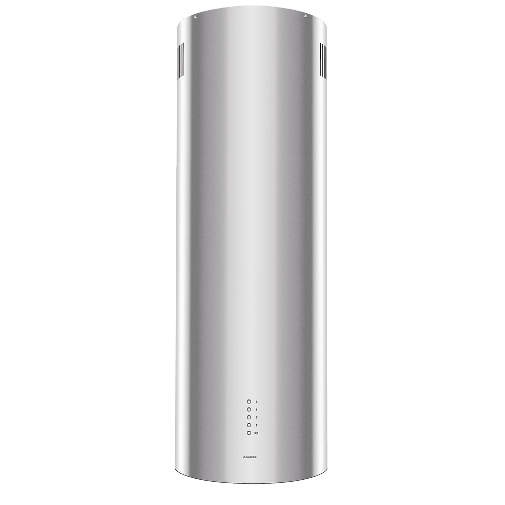- Элегантный акцент в современном интерьере: Цилиндрическая форма и блеск нержавеющей стали превращают вытяжку не только в функциональный прибор, но и в элемент современного кухонного дизайна.
