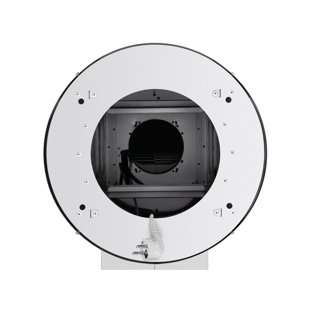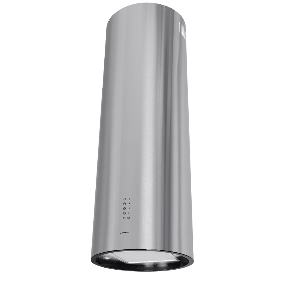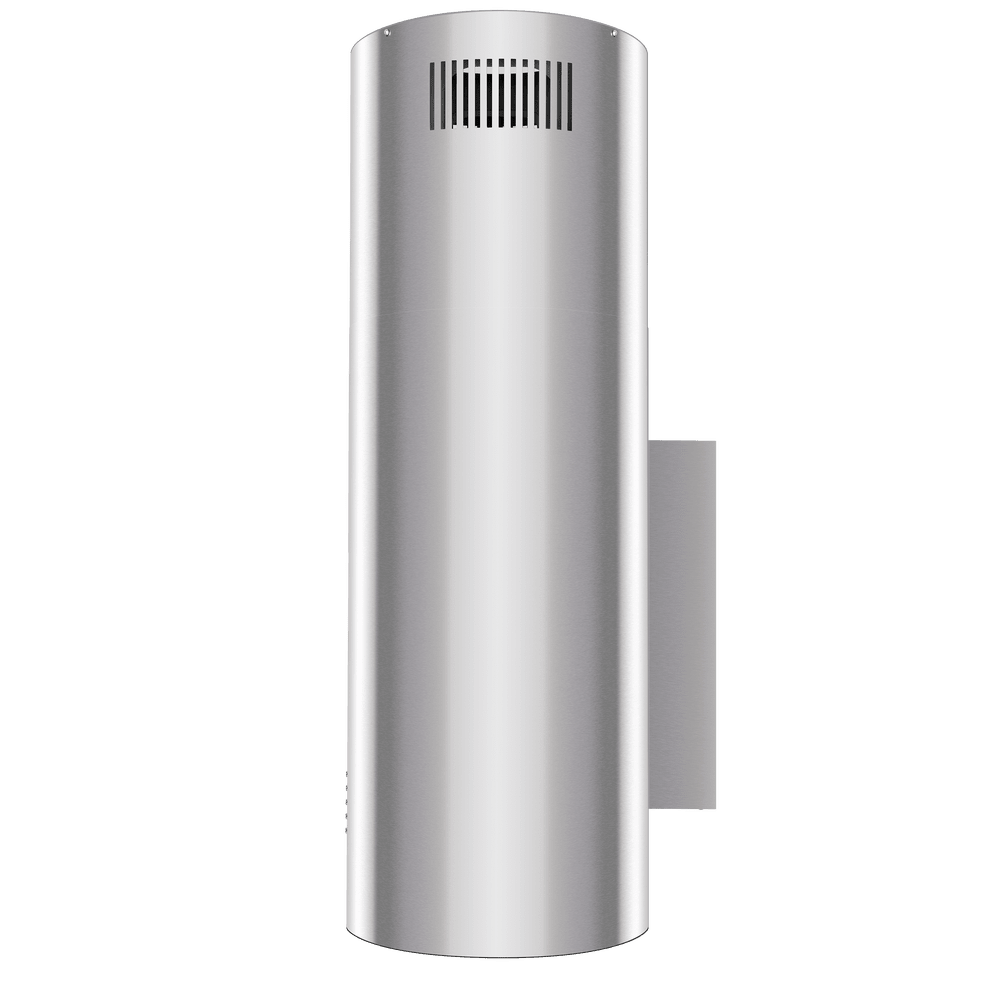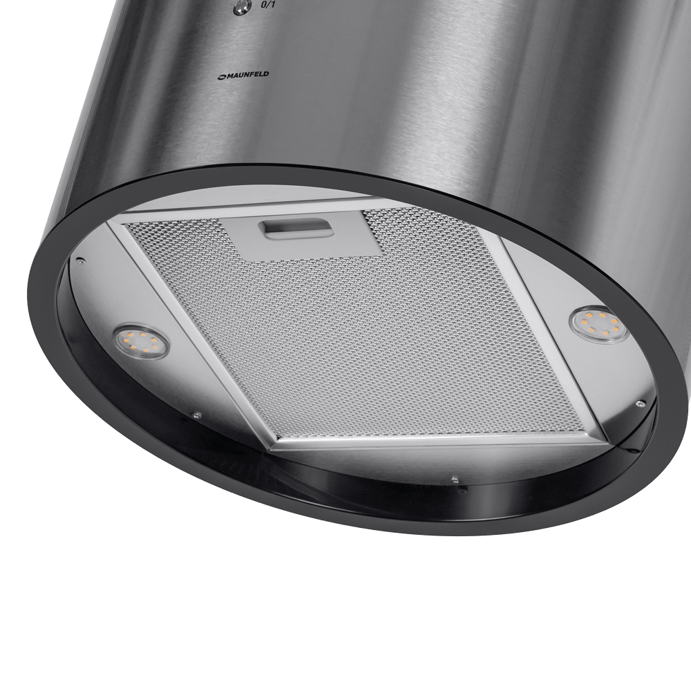 - Элегантный акцент в современном интерьере: Цилиндрическая форма и блеск нержавеющей стали превращают вытяжку не только в функциональный прибор, но и в элемент современного кухонного дизайна.