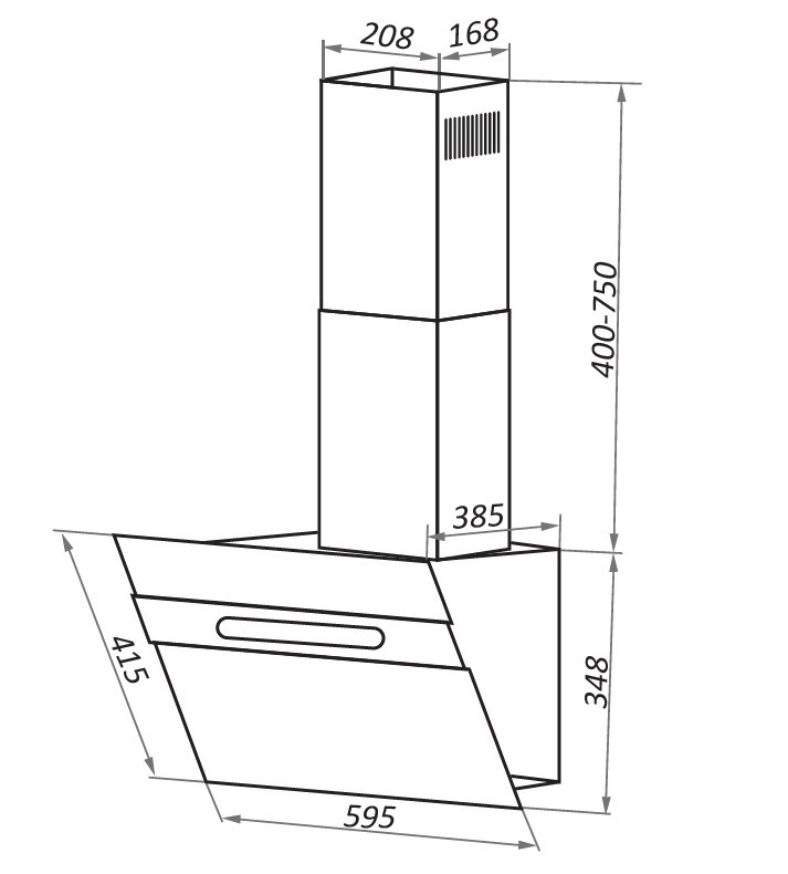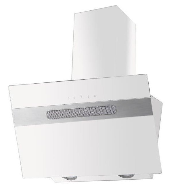 - Стильный дизайн из белого стекла с нержавеющей сталью и наклонной панелью: Элегантная комбинация белого стекла и металлической вставки, дополненная современной наклонной формой, позволяет вытяжке стать гармоничным элементом кухни в стиле хай-тек, сканди или минимализм.