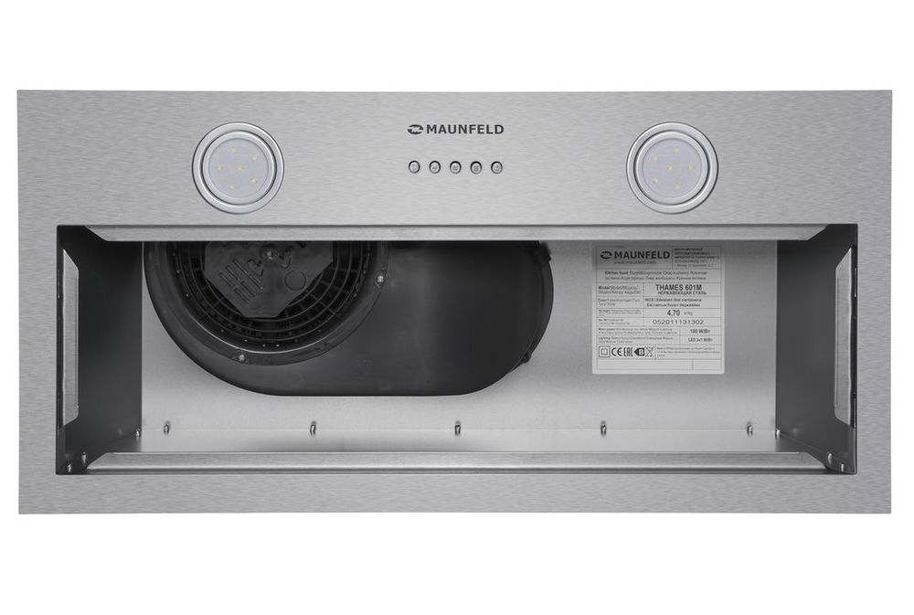 Встраиваемая вытяжка Maunfeld THAMES 601M Inox — это классическое и надежное решение для кухни. Модель в цвете нержавеющая сталь полностью интегрируется в навесной шкаф над плитой, сохраняя лаконичный вид интерьера. Управление осуществляется с помощью удобного кнопочного интерфейса. Рабочую зону эффективно освещают две яркие LED-лампы. Вытяжка оснащена мощным итальянским мотором, который обеспечивает тихую работу — уровень шума не превышает 50 дБ. Прибор работает в двух режимах: отвод и рециркуляция, обеспечивая гибкость установки и эффективную очистку воздуха от запахов и жира.