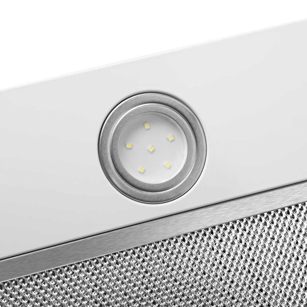 - Универсальный лаконичный дизайн: Белый цвет и полностью скрытый в шкафу корпус делают вытяжку максимально незаметной. Это позволяет ей органично вписываться в интерьеры любого стиля — от классики и ретро до современного минимализма, не нарушая целостности дизайнерской концепции.