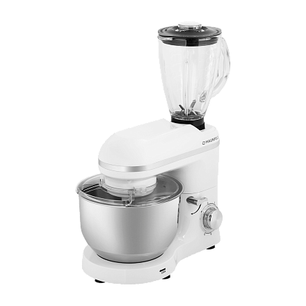 Кухонный комбайн MAUNFELD MF-435WH PRO — это многофункциональное устройство, выполненное в стильном белом цвете, которое объединяет в себе функции мощного планетарного миксера и компактного блендера. Благодаря продуманной конструкции и универсальности, этот прибор станет незаменимым помощником для приготовления самых разнообразных блюд — от воздушных десертов до густого теста и питательных смузи. Планетарный миксер обеспечивает особенно тщательное и равномерное перемешивание ингредиентов: насадка вращается вокруг своей оси и одновременно движется по всей окружности чаши, гарантируя идеальную консистенцию без комочков и непромешанных участков. Управление осуществляется при помощи удобного поворотного переключателя, который позволяет плавно регулировать скорость и выбирать оптимальный режим для каждой задачи. В богатую комплектацию входит набор необходимых насадок: крюк для замешивания дрожжевого и крутого теста, венчик для взбивания яиц, сливок и кремов, а также насадка для бережного перемешивания. В комплекте также предусмотрена удобная крышка на чашу, предотвращающая разбрызгивание ингредиентов во время работы. Встроенный блендер позволяет быстро измельчать овощи, фрукты, орехи и готовить коктейли, расширяя функциональность прибора. Прочный корпус и качественные материалы обеспечивают долговечность и устойчивость устройства даже на высоких скоростях.