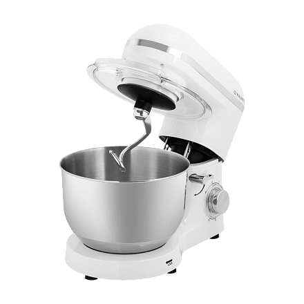 - Планетарный миксер и богатая комплектация: Уникальная система планетарного вращения гарантирует, что насадка обрабатывает весь объем чаши. В комплект входят все основные насадки: крюк для густого теста, венчик для взбивания, лопатка для бережного перемешивания и крышка на чашу.