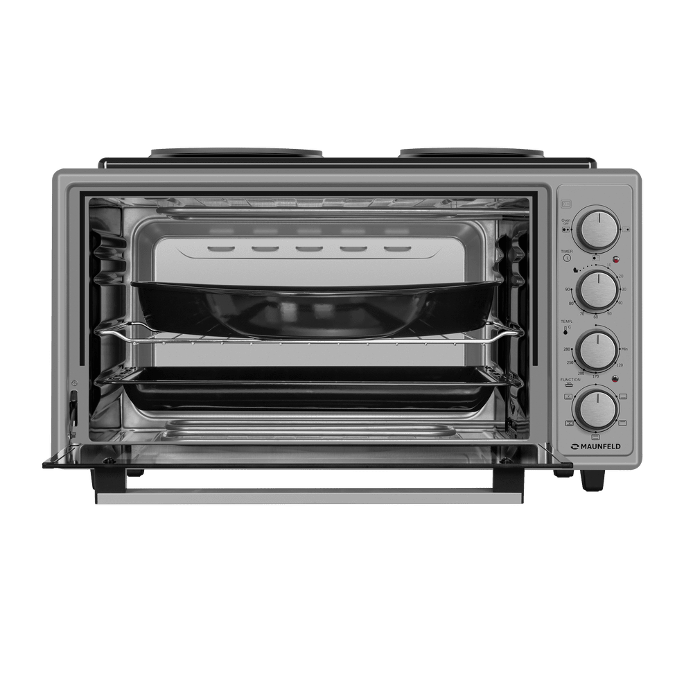 Мини-печь MAUNFELD MMO-483MGR01H — это функциональный и продуманный кухонный прибор, который сочетает в себе возможности духового шкафа и двух дополнительных конфорок. Модель выполнена в корпусе из нержавеющей стали и оснащена 2 конфорками, расположенными сверху устройства. Это позволяет одновременно использовать печь для запекания и, например, готовить соус или гарнир на плите, значительно экономя время и пространство на кухне. Управление осуществляется с помощью удобных поворотных регуляторов, которые делают эксплуатацию простой и наглядной — все необходимые режимы и настройки всегда у вас перед глазами. Специальный встроенный вентилятор (конвекция) равномерно распределяет горячий воздух по всей внутренней камере, обеспечивая идеальное пропекание продуктов со всех сторон. Благодаря этому блюда получаются равномерно прожаренными, с аппетитной корочкой снаружи и сочными внутри. Объем камеры позволяет готовить разнообразные блюда для всей семьи. Прочный корпус и качественные материалы гарантируют долговечность и надежность. Богатая комплектация (противни и решетка входят в набор) позволяет сразу приступить к приготовлению. Благодаря сочетанию дополнительных конфорок, конвекции и удобного управления, эта мини-печь станет многофункциональным центром вашей кухни.
