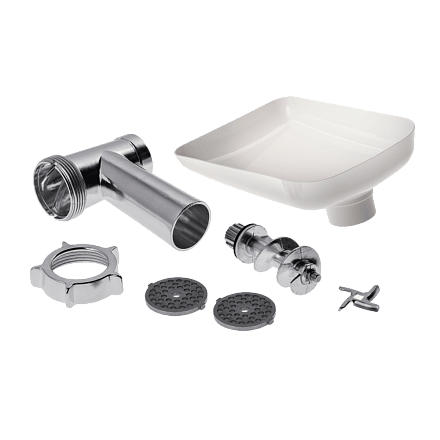- Богатая комплектация и толкатель-контейнер: Наличие трех дисков для фарша и насадок расширяет возможности. Удобный толкатель служит также контейнером для хранения аксессуаров.