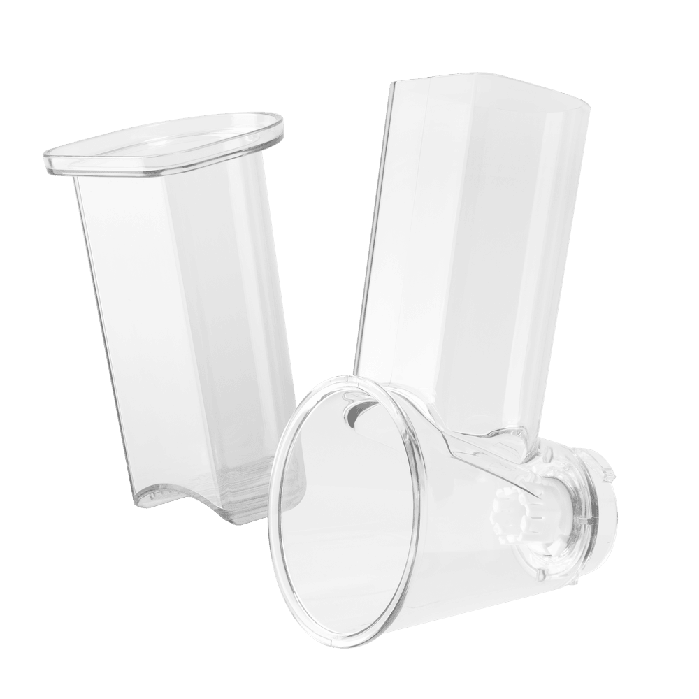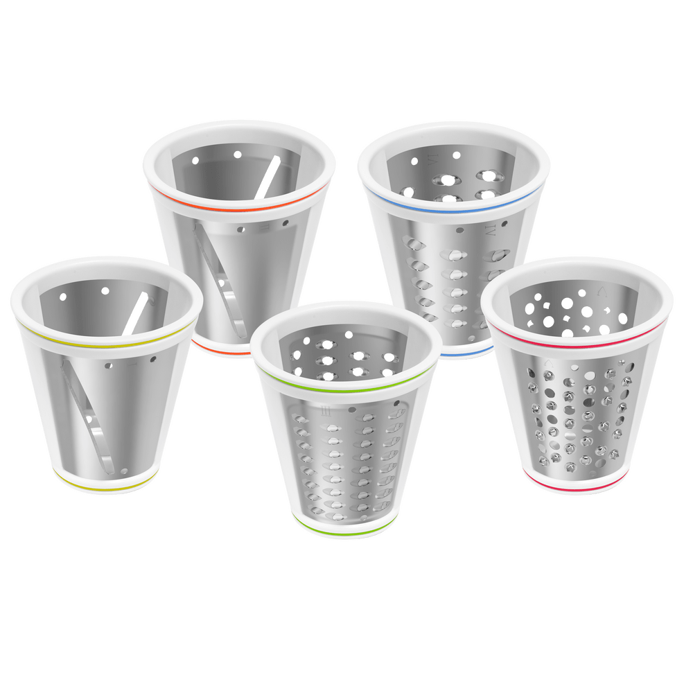- 5 насадок-конусов из нержавеющей стали: В комплект входят 5 разноцветных конусов из качественной нержавеющей стали, позволяющих натирать, нарезать кусочками и ломтиками. Они долговечны и не требуют заточки.