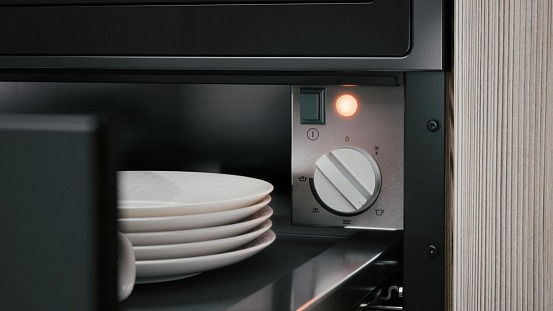 Управление осуществляется с помощью поворотной ручки для выбора режимов работы. Устройство выполняет функции подогрева посуды, размораживания и приготовления при низких температурах.