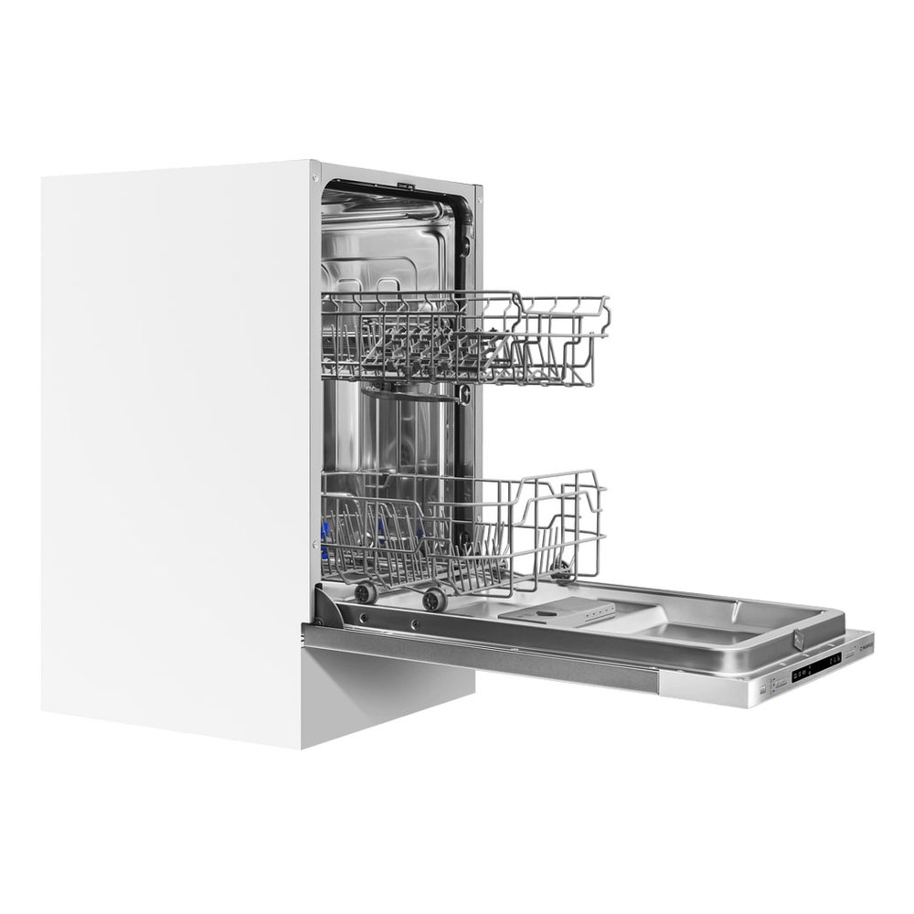 - Компактные размеры и вместимость: Ширина всего 45 см, но вмещает до 9 комплектов посуды, что идеально для больших семей и тех, кто часто устраивает приемы гостей.
