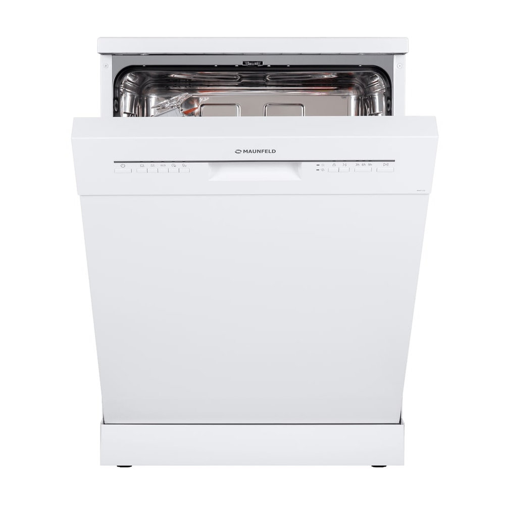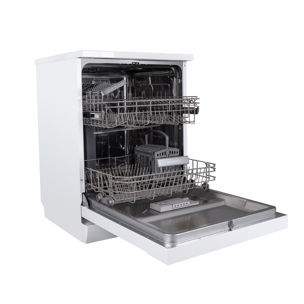 Посудомоечная машина Maunfeld MWF12S — это вместительная отдельностоящая модель в элегантном белом корпусе, рассчитанная на мытье до 12 комплектов посуды. Устройство имеет полноразмерные габариты (ширина 59.8 см) и оснащено двумя корзинами, полкой для чашек и лотком для столовых приборов. Для гибкости загрузки предусмотрена регулируемая по высоте верхняя корзина. Управление осуществляется с помощью кнопок, доступны 5 программ мойки (быстрая, экономичная, 90 минут, стандартная, интенсивная). Ключевые функции: отсрочка старта (3/6/9 часов), половинная загрузка для экономии, индикатор наличия соли и поддержка средств «3 в 1». Надежность обеспечивают полная защита от протечек и система самодиагностики. Завершает цикл автоматическое открывание дверцы для эффективной сушки.