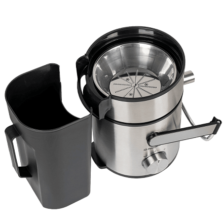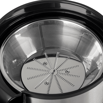 - Фильтр-терка из нержавеющей стали: Прочный и долговечный фильтр-терка из нержавейки обеспечивает эффективное отделение сока от жмыха, гарантируя чистоту и качество готового напитка.