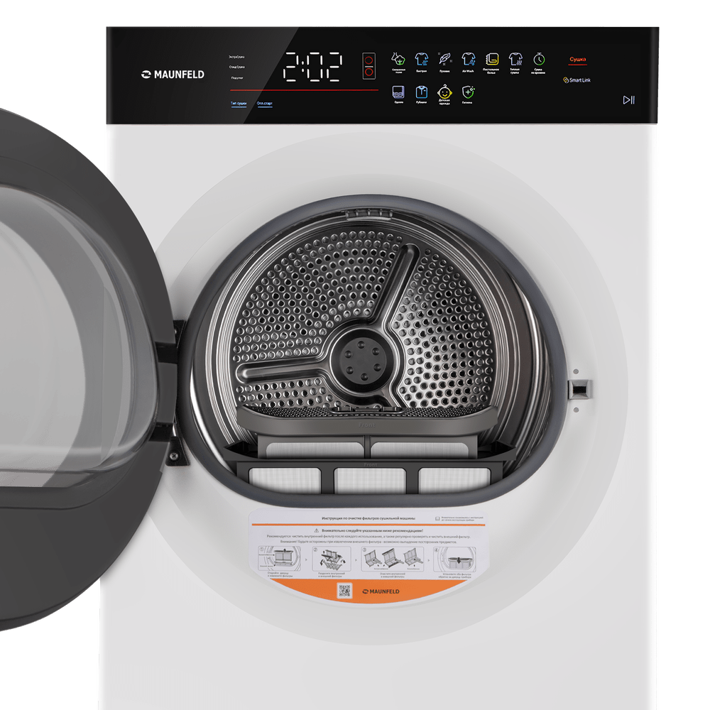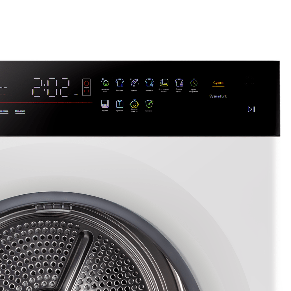 - Ключевые программы: Смешанные ткани, гигиеническая, детская одежда, рубашки/блузы, пуховые изделия, одеяла, постельное белье, интенсивная, холодная вода, воздушная стирка, очистка барабана