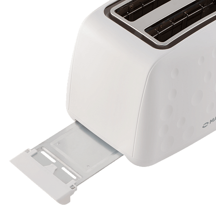 - Съемный поддон для сбора крошек: Удобный выдвижной поддон легко очищается от крошек, что позволяет поддерживать идеальную чистоту внутри тостера и предотвращает появление запаха горелого.