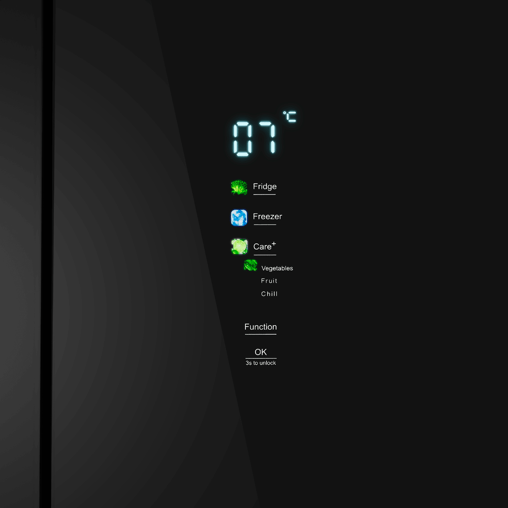 - Контейнеры Humidity и Care — специальные отделения для овощей, фруктов и зелени с контролем влажности