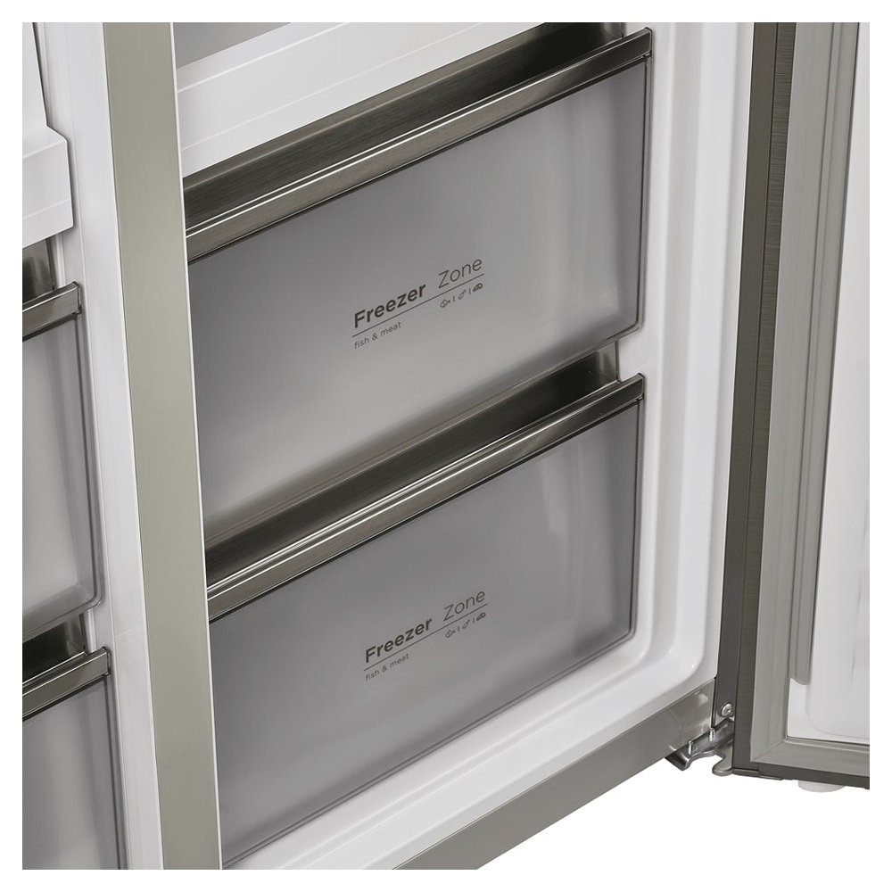 - Система оповещения: индикация открытой двери и сигнализация о повышении температуры в морозильной камере.