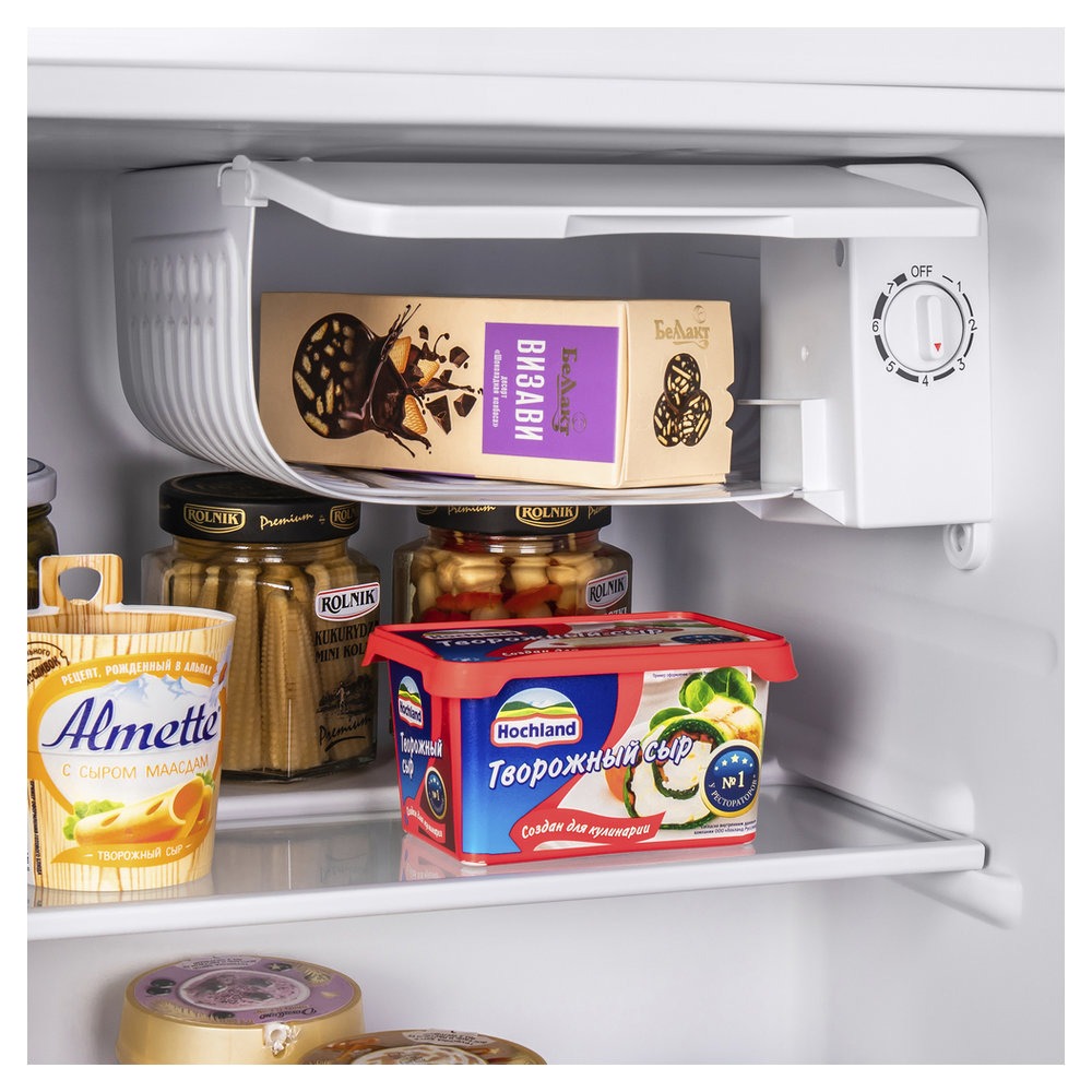 Внутреннее пространство организовано функционально: одна из полок выполнена из закаленного стекла и регулируется по высоте, позволяя размещать продукты различных размеров. Управление осуществляется с помощью простого механического регулятора.