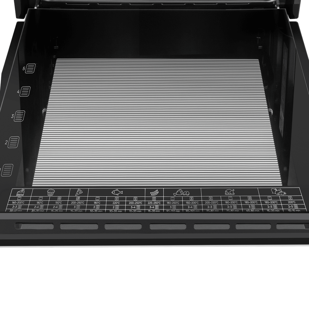 - Универсальные режимы приготовления: Прибор оснащён режимами верхнего/нижнего нагрева, интенсивной выпечки с конвекцией, гриля и гриля с конвекцией. Максимальная температура нагрева — 250°C.