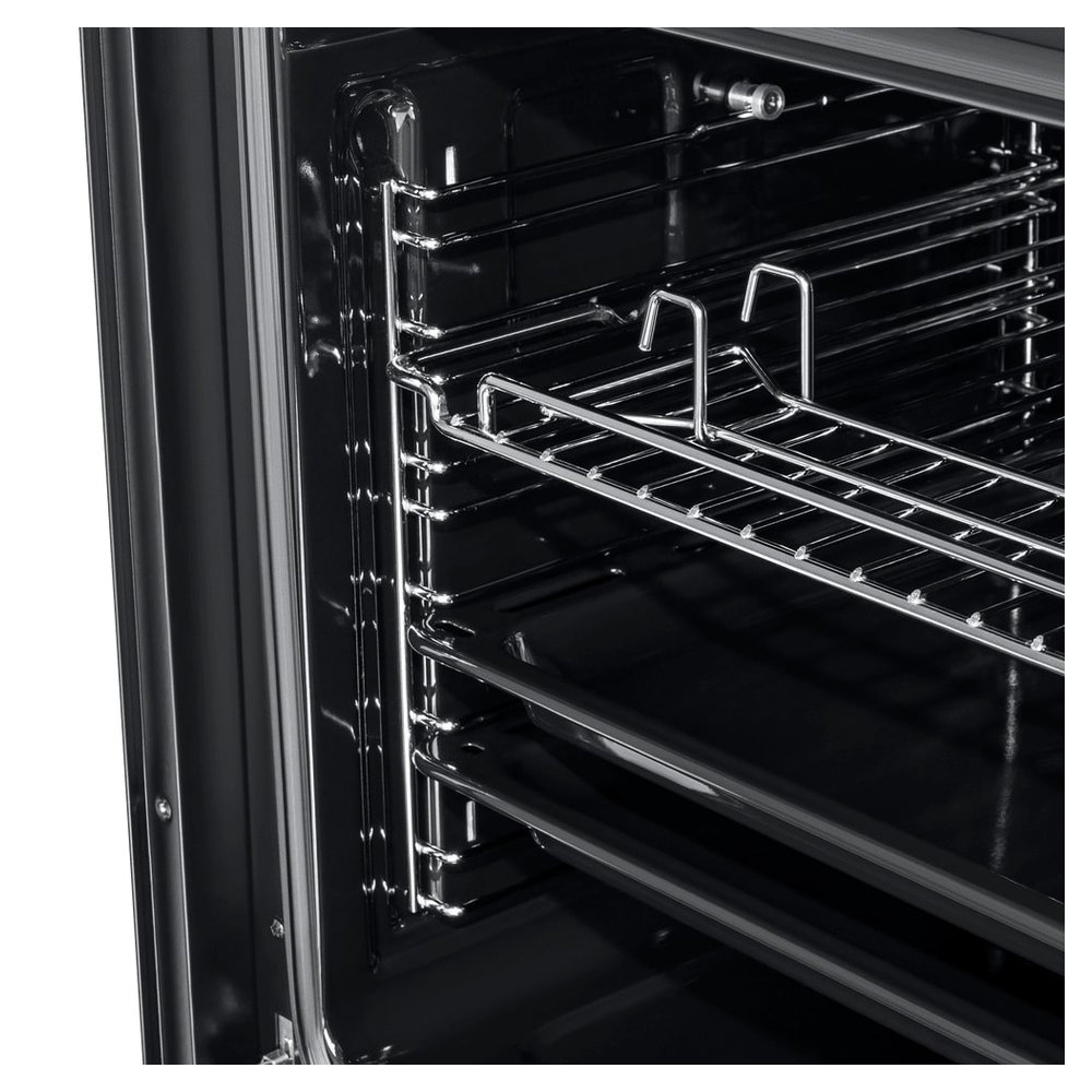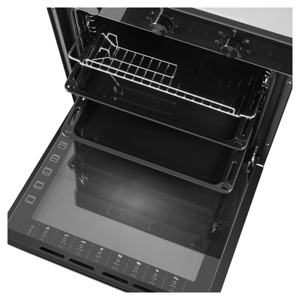 - Профессиональная эргономика и удобство: Духовой шкаф оснащен полным комплектом телескопических направляющих для противней, которые плавно выдвигаются и фиксируются, обеспечивая безопасный и легкий доступ к тяжелой или горячей посуде без риска опрокидывания.