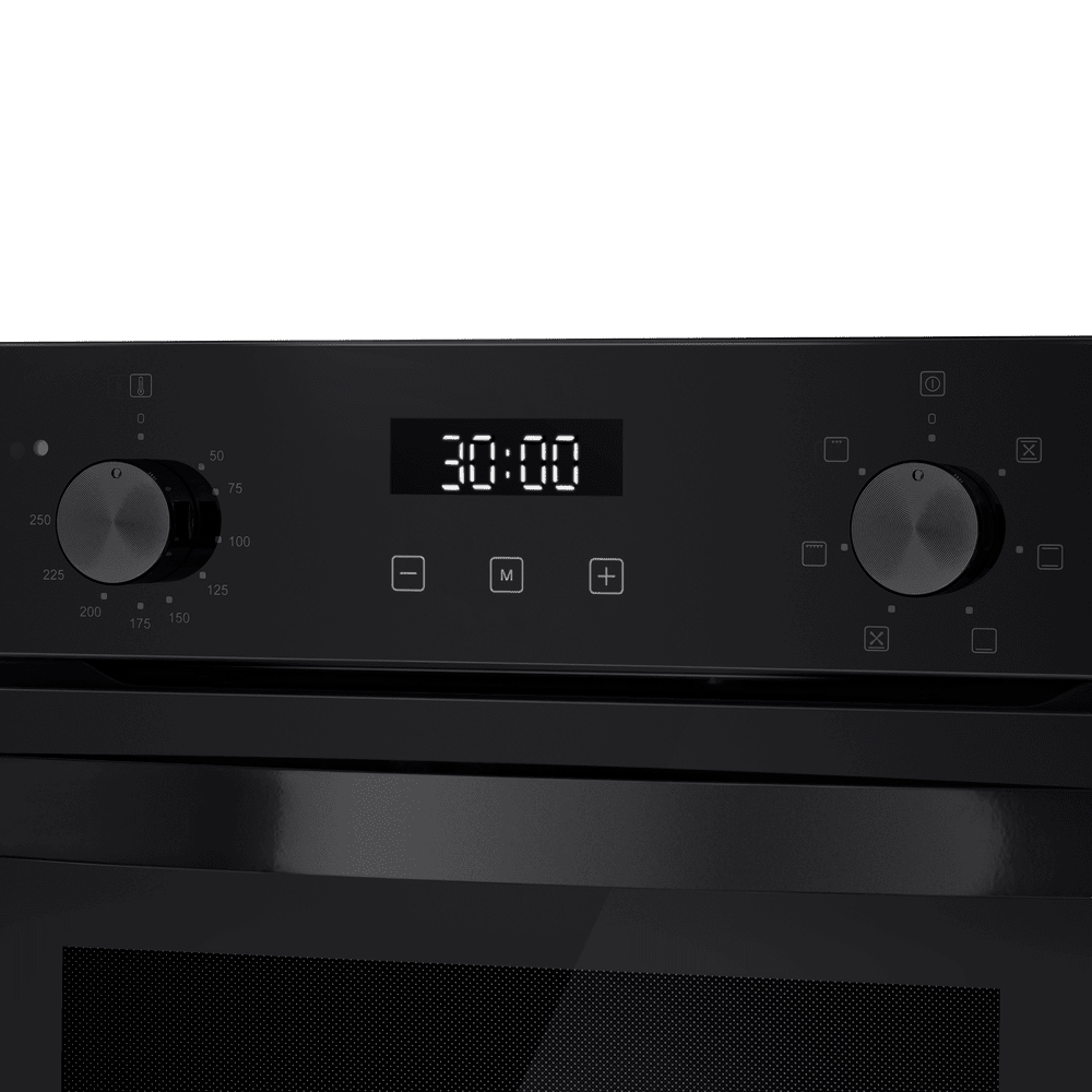 - Гибридная панель управления: Сенсорный программатор отвечает за выбор программ и функций, а механические поворотные переключатели обеспечивают быстрое и точное выставление температуры и времени, объединяя удобство сенсорного ввода и надежность механики.