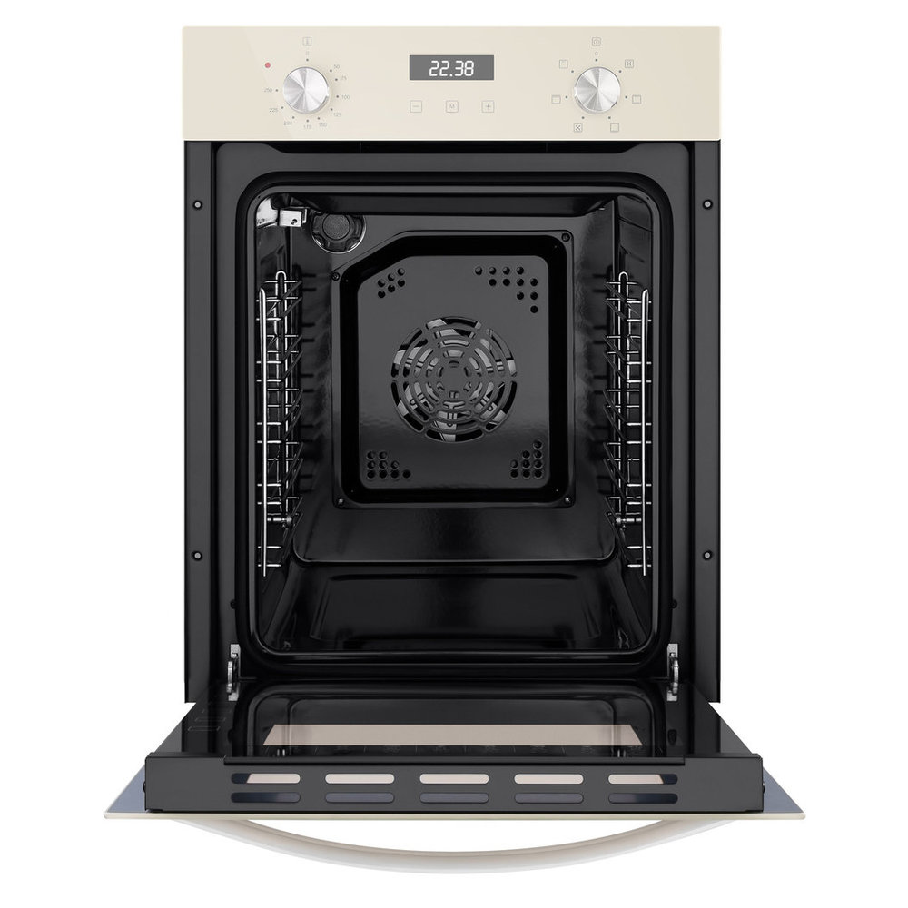 - Стильный акцент и кулинарная универсальность в одном приборе: Уникальный бежевый цвет позволяет духовому шкафу стать изюминкой интерьера, а набор из шести режимов дает возможность с легкостью справляться с повседневной готовкой и праздничными застольями.
