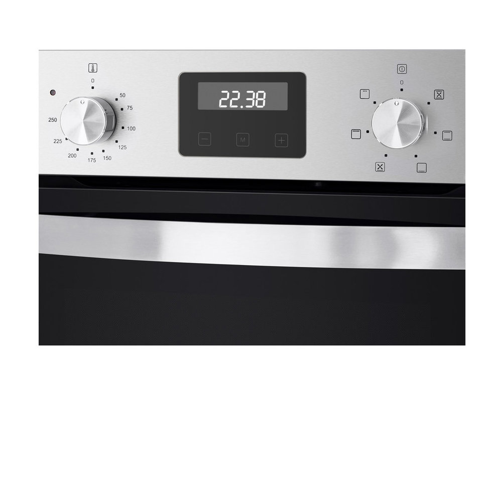 - Гибридная панель управления: Сенсорный программатор отвечает за выбор функций и программ, обеспечивая современный интерфейс. Поворотные переключатели позволяют быстро и точно задать температуру и время, что особенно удобно в процессе готовки.