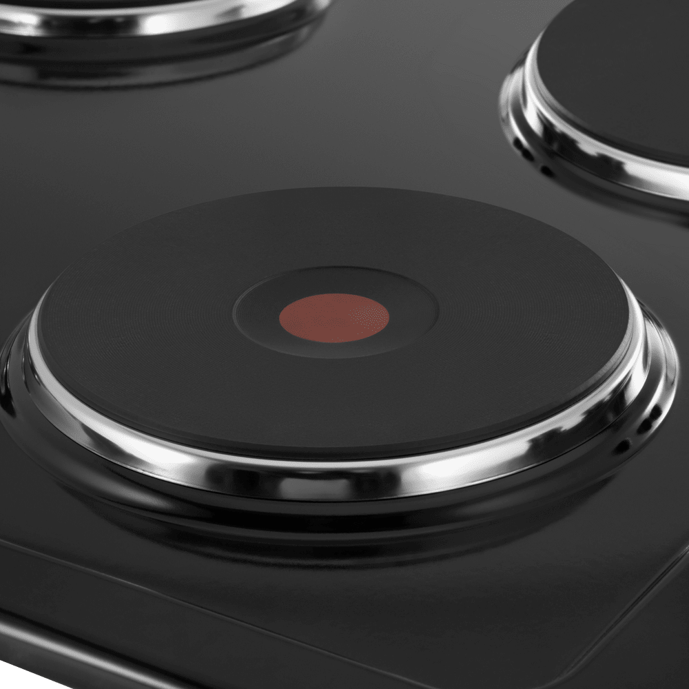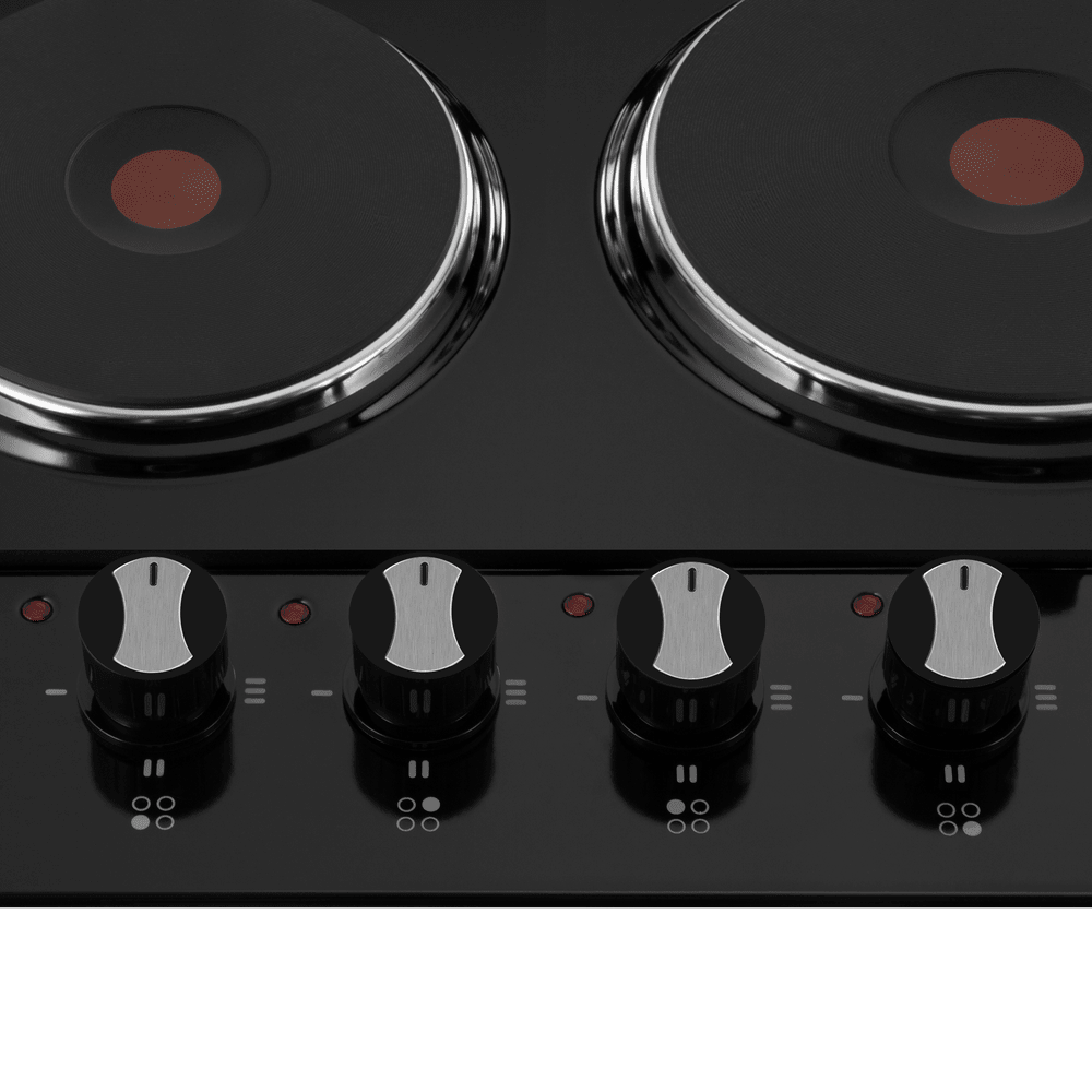 - Надежное и простое механическое управление: Панель оснащена механическими поворотными переключателями, расположенными на боковой стороне. Высокопрочные термостойкие пластиковые ручки серебристого цвета обеспечивают тактильный, интуитивно понятный и абсолютно надежный контроль над мощностью каждой конфорки, без риска сбоев, характерных для электроники.