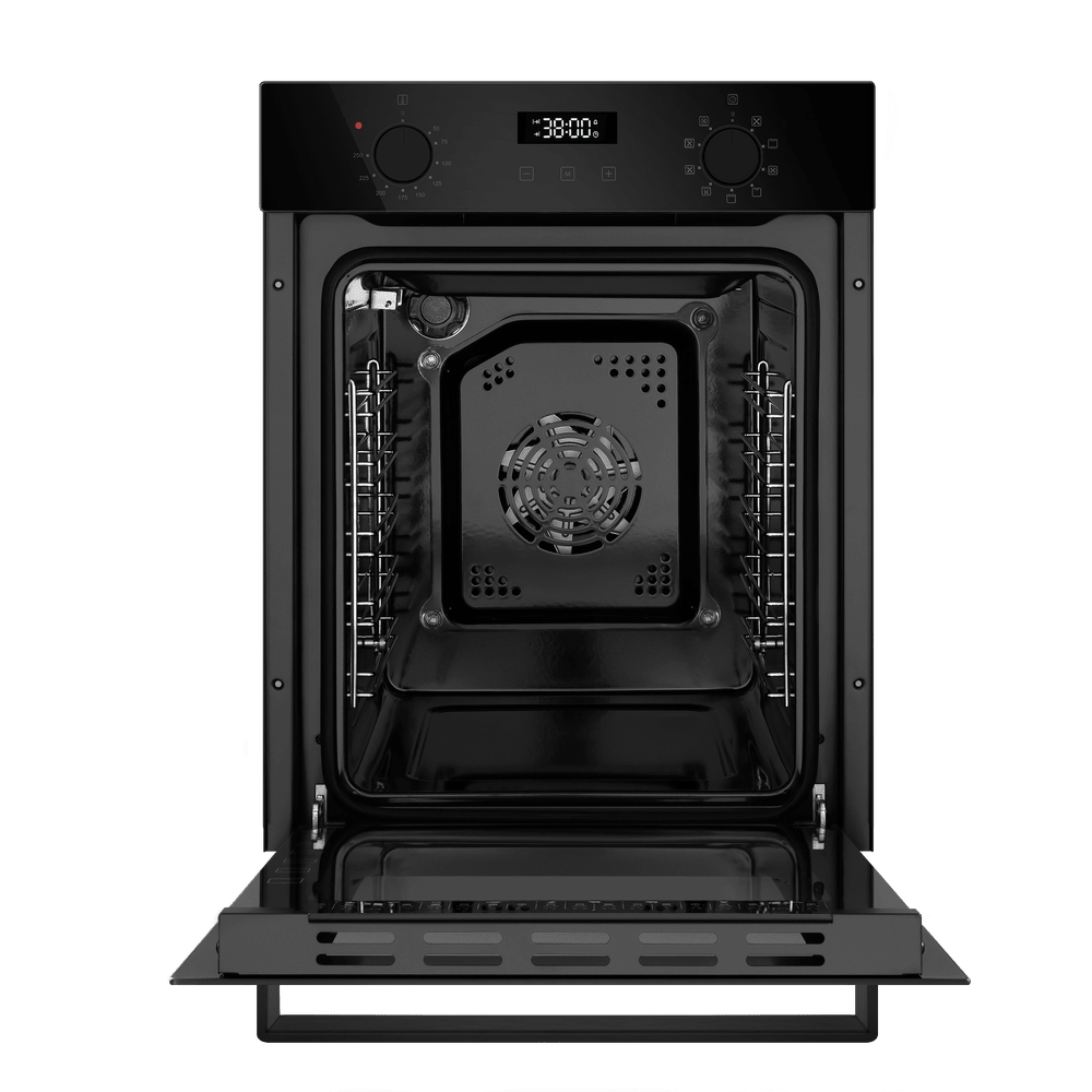 Духовой шкаф Maunfeld EOEM519PB2 воплощает в себе элегантную строгость и высокую функциональность. Его внешний вид — глубокий черный корпус с оформлением из матовой черной нержавеющей стали — создает современный и сдержанный образ, который станет органичным элементом минималистичной, скандинавской или контрастной кухни. Прибор обладает исключительной эргономикой: компактная ширина 45 см и глубина 55 см позволяют легко интегрировать его в узкую нишу стандартного кухонного модуля, не занимая лишнего пространства. При этом рабочая камера объемом 49 литров остается достаточно вместительной для использования стандартных противней и приготовления полноценных блюд. Управление построено на передовой электронной системе, сочетающей сенсорный программатор, поворотные переключатели и информативный цифровой дисплей для полного контроля над процессом готовки.