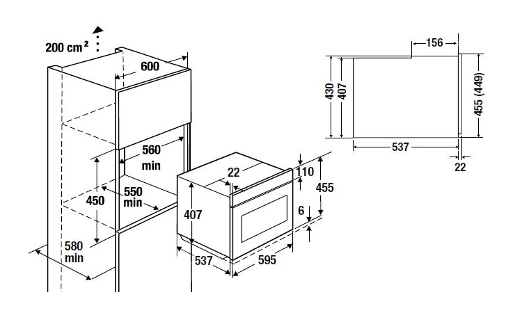Размеры прибора (Ш x В x Г): ≈ 595 x 455 x 559 мм (вкл. фронт)