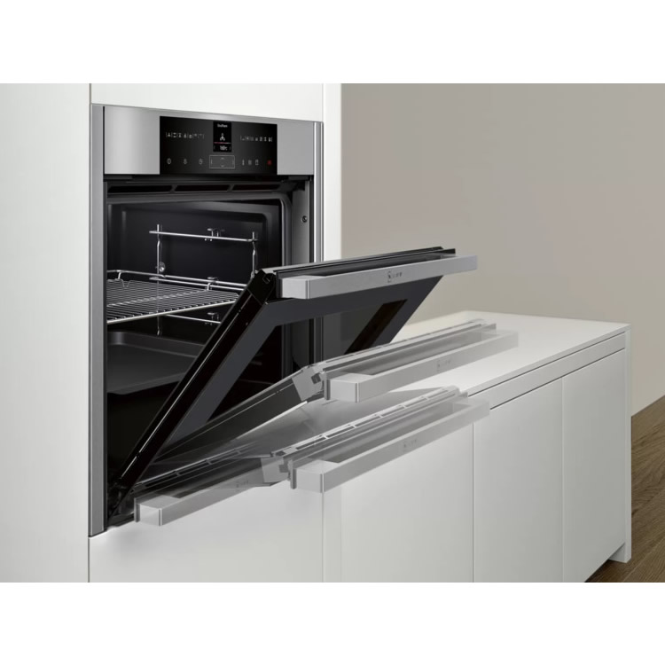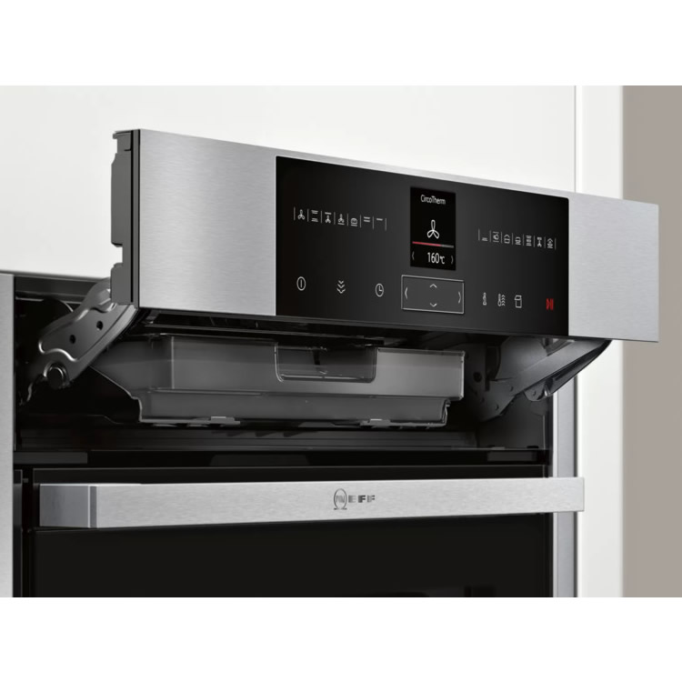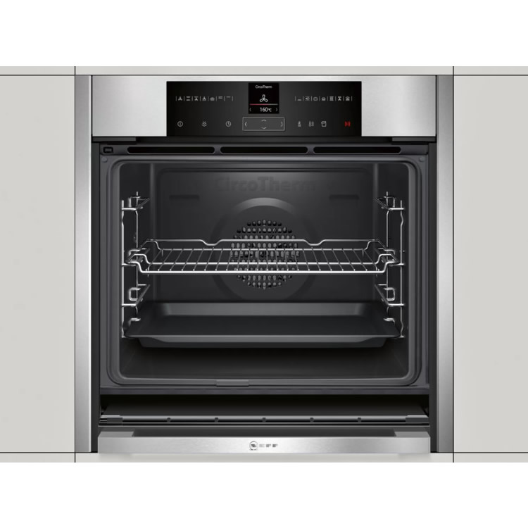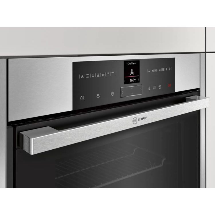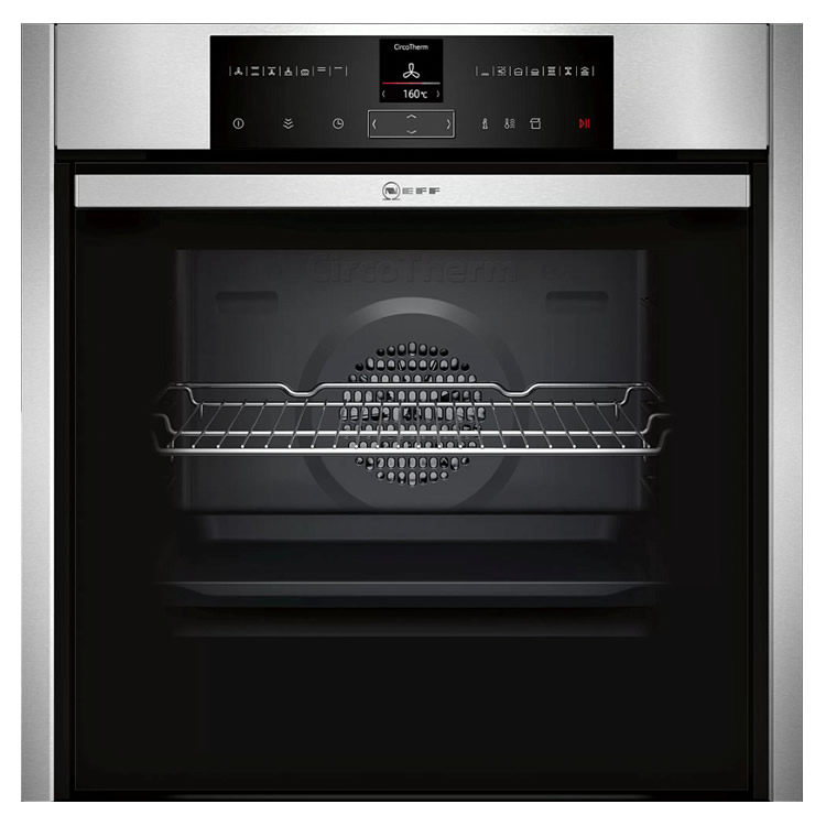 Электрический духовой шкаф Neff B55VR22N0 отлично подойдет для тех, кто любит и умеет готовить. С его помощью вы сможете создавать дома блюда, достойные лучших ресторанов. Он оборудован уникальной системой CircoTherm, которая обеспечивает равномерное распределение горячего воздуха по всей рабочей камере, гарантируя идеальное приготовление пищи. Независимо от того, сколько противней находится внутри, один или три, любое блюдо приготовится идеально. Дверца выполнена по технологии Slide & Hide. Ее можно не просто откинуть, а убрать внутрь корпуса. Во-первых, это удобно для загрузки и выгрузки продуктов, а во-вторых, так меньше вероятность получить ожог.